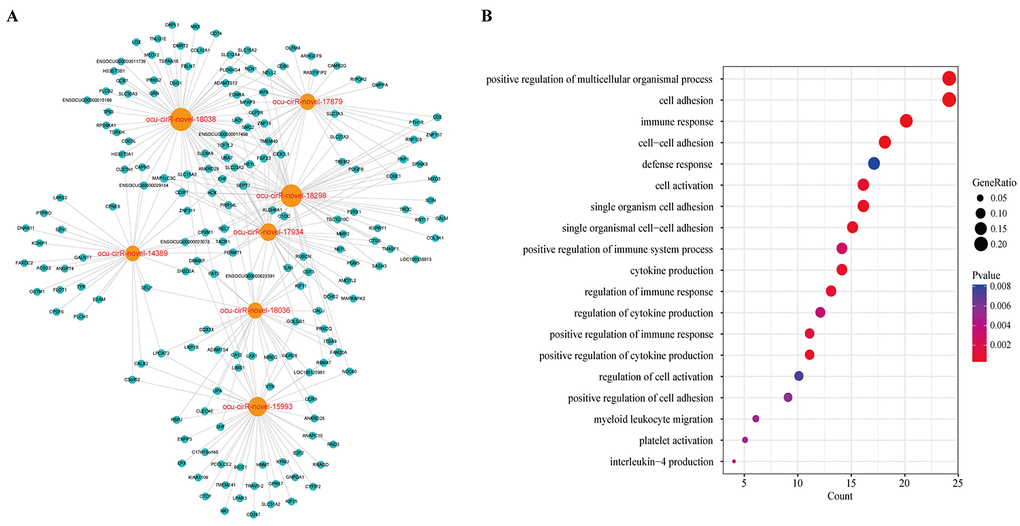 Based on the above results, we extracted the genes from the cell adhesion and cell activation categories and their corresponding miRNAs and circRNAs from the DEcircRNA-DEmiRNA-DEmRNA triple network to form sub-network, respectively. In the cell adhesion sub-network, 112 circRNAs and 60 mRNAs competed for 70 miRNAs (Supplementary Figure S2A). Meanwhile, 111 circRNAs and 42 mRNAs competed for 69 miRNAs in the cell activation sub-network (Supplementary Figure S2B). The sub-network indicated that one mRNA might compete with multiple circRNAs. In particular, many circRNAs were predicted to participate in 2 sub-networks at the same time. Therefore, it is reasonable to predict that these circRNAs might contribute to the molecular regulation of atherosclerosis.