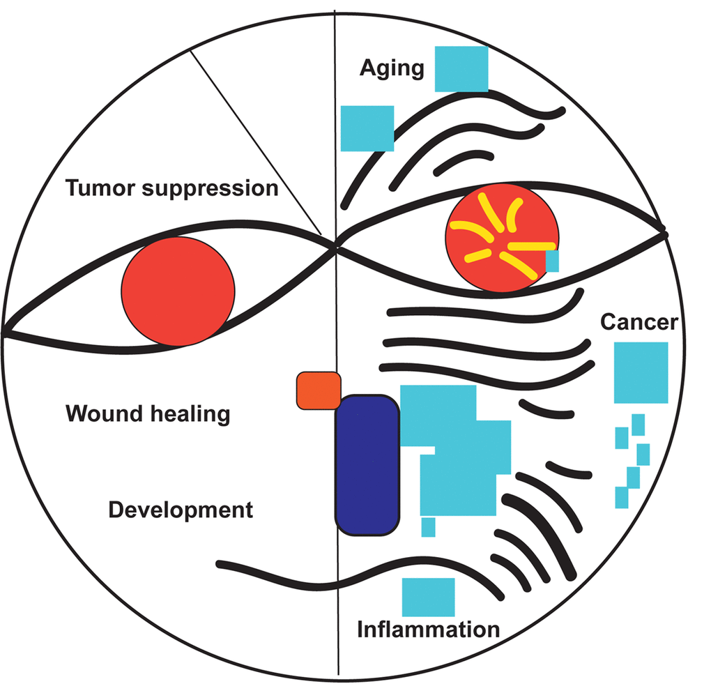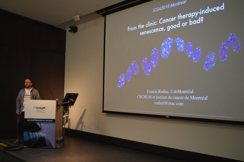 More than two hundred scientists gathered in Montreal on July 8, 2018 for the International Cellular Senescence Association (ICSA) Meeting to discuss the biological and medical impact of cellular senescence. The meeting was organized by Gerardo Ferbeyre (Université de Montréal, Canada), Francis Rodier, (Université de Montréal, Canada) and Daohong Zhou (University of Florida, USA). In his welcoming speech, Dr. Ferbeyre summarized the key aspects that have attracted so much interest in cellular senescence including its ability to act as a tumor suppressor mechanism but also to promote aging and age-linked diseases (Figure 1). The dual nature of senescence was also highlighted in talks from Judith Campisi (Buck Institute for Research on Aging, USA), ICSA president Manuel Serrano (IRB, Spain) and NCI director Ned Sharpless (National Cancer Institute, USA). Dr. Sharpless presented in his keynote lecture how the key senescence gene and tumor suppressor p16INK4A acts as a double-edged sword to regulate aging, health span and cancer incidence.