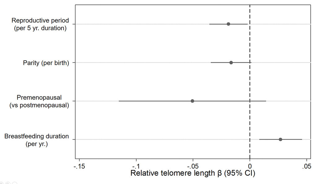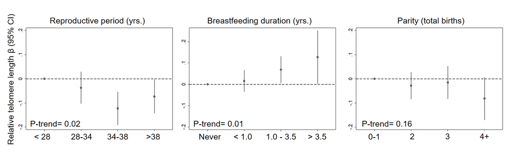 Findings using a replication sample are reported in Supplementary Table 3. Associations of rTL with reproductive period and breastfeeding were not replicated. Although the direction of the association was similar for our findings for parity, point estimates for all associations were weaker compared to estimates from the discovery population.