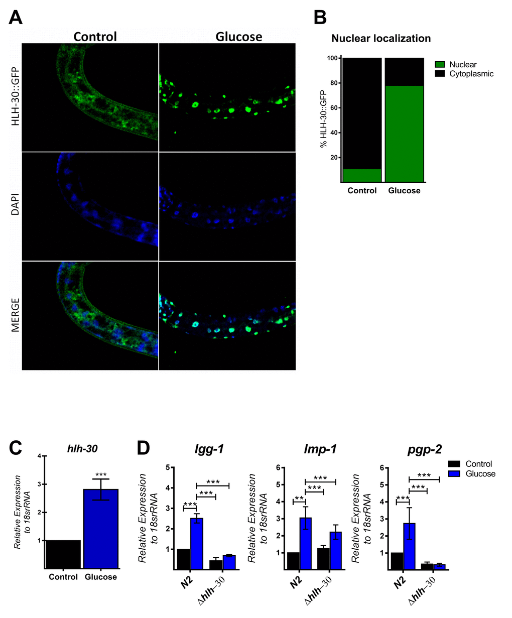 The autophagic machinery may be transcriptionally activated by HLH-30, a C. elegans homolog of mammalian TFEB [23]. Under normal conditions, HLH-30 localizes mainly in the cytosol but rapidly translocates to the nucleus under stress conditions to promote cellular adaptation by upregulating the transcription of autophagic and lysosomal genes [23]. To investigate whether high glucose modified HLH-30 intracellular localization, we used a transgenic HLH-30::GFP reporter nematode strain fed a high glucose diet for 24 h. As shown in Figure 2A and B, a high glucose diet significantly stimulated HLH-30 nuclear localization from the cytosol to the nucleus. Consistent with its proposed autoregulatory feedback loop [11], HLH-30 mRNA increased 3-fold in the N2 strain under the same experimental conditions (Figure 2C). However, a high glucose diet had no effect on the expression of these same genes in the hlh-30 mutant strain (Figure 1B and 2D). Together, these data revealed that a high glucose diet activates ATGs through the HLH-30-activated transcription factor.
