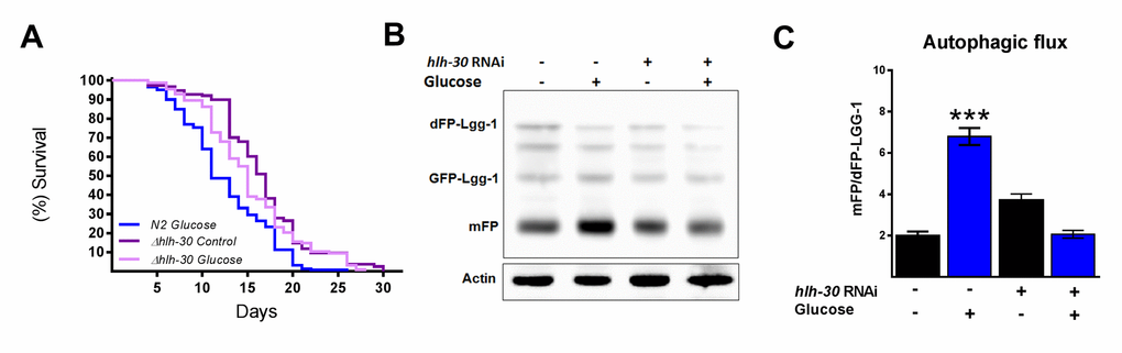 It has been suggested that autophagy and its major regulator TFEB might promote either survival or cell death under certain stress conditions [12]. Therefore, because we observed that HLH-30 and the autophagic process are active under excess glucose, we tested whether the absence of HLH-30 could abrogate the decreased lifespan in high glucose-fed animals. To this end, we grew nematodes of the hlh-30 mutant strain with a high glucose diet and measured their lifespan (Figure 3A). We found that the absence of hlh-30 with a high glucose diet allowed the re-establishment of the control lifespan expectancy (Figure 3A). Because both mammalian TFEB and its C. elegans homolog HLH-30 are major regulators of autophagy and to better understand the role of HLH-30 in defining the lifespan through the autophagic process, we depleted HLH-30 in nematodes by RNA interference (RNAi), and autophagic flux was analyzed. Accordingly, hlh-30 RNA silencing (Supplementary Figure 1) significantly reduced autophagic flux since these animals had a diminished mFP/dFP-LGG-1 ratio (Figure 3B and C). These results indicated that HLH-30 is involved in mediating glucose-dependent autophagic flux and might be the major reason for the life limitation in C. elegans.