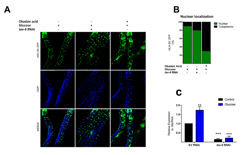 Because mammalian TFEB activation is achieved by dephosphorylation through calcium-dependent calcineurin protein phosphatase [24], we reasoned that a similar mechanism might be involved in HLH-30 activation. To examine whether TAX-6, an ortholog of mammalian calcineurin A, has a similar effect on HLH-30 localization, we grew the HLH-30::GFP transgenic strain under a high glucose diet and performed a tax-6 RNAi knockdown. Our results showed that tax-6 RNAi (Figure 4C) fails to inhibit the nuclear accumulation of HLH-30 in glucose-treated worms (Figure 4A and B), suggesting that HLH-30 activation is a calcineurin-independent mechanism. It has been suggested that other families of phosphatases, specifically PP2Ac, may regulate TFEB activity [15]. To investigate this hypothesis, we simultaneously treated worms with high glucose and okadaic acid (OA), a specific inhibitor of the PP1 and PP2A protein phosphatases [25], at different concentrations (30, 60, 120 and 240 nM) for 24 h and found that the nuclear localization of HLH-30 was modified in a dose-dependent manner (Supplementary Figure 2). Nematodes incubated with 30 and 60 nM of OA displayed nuclear HLH-30 with low amounts in the cytoplasm, whereas at 120 and 240 nM, the localization was preferentially cytosolic (Supplementary Figures 2A and B). Therefore, due to the high cytosolic HLH-30 detected in nematodes treated with 120 nM, we used this OA concentration, that generally is used to evaluate the effect of OA on phosphatase (PP2A) [15], to determine that the localization of HLH-30 is mediated by PP2A protein phosphatase (Figure 4A, right panel) instead of calcineurin/TAX-6 because tax-6 knockdown did not modify the cellular localization of HLH-30 (Figure 4A, middle panel).