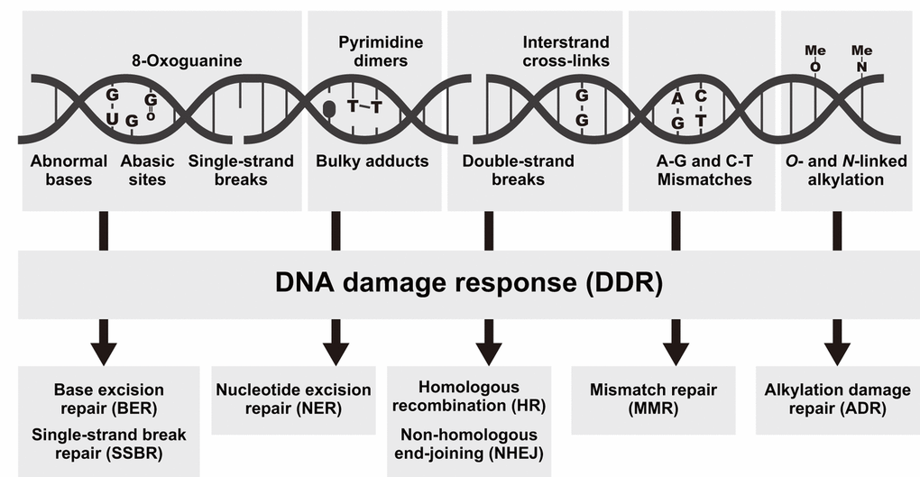 | DDR, DNA damage response; NER, nucleotide excision repair; HR, homologous recombination; NHEJ, non-homologous end-joining; MMR, mismatch repair; ADR, alkylation damage repair. The genes written in bold were used for quantitative PCR analysis in this study. | |||||||||||||||||||||||||||||||||||||||||||||||||||||||||||||||||||||||||||||||||||||||||||||||||||