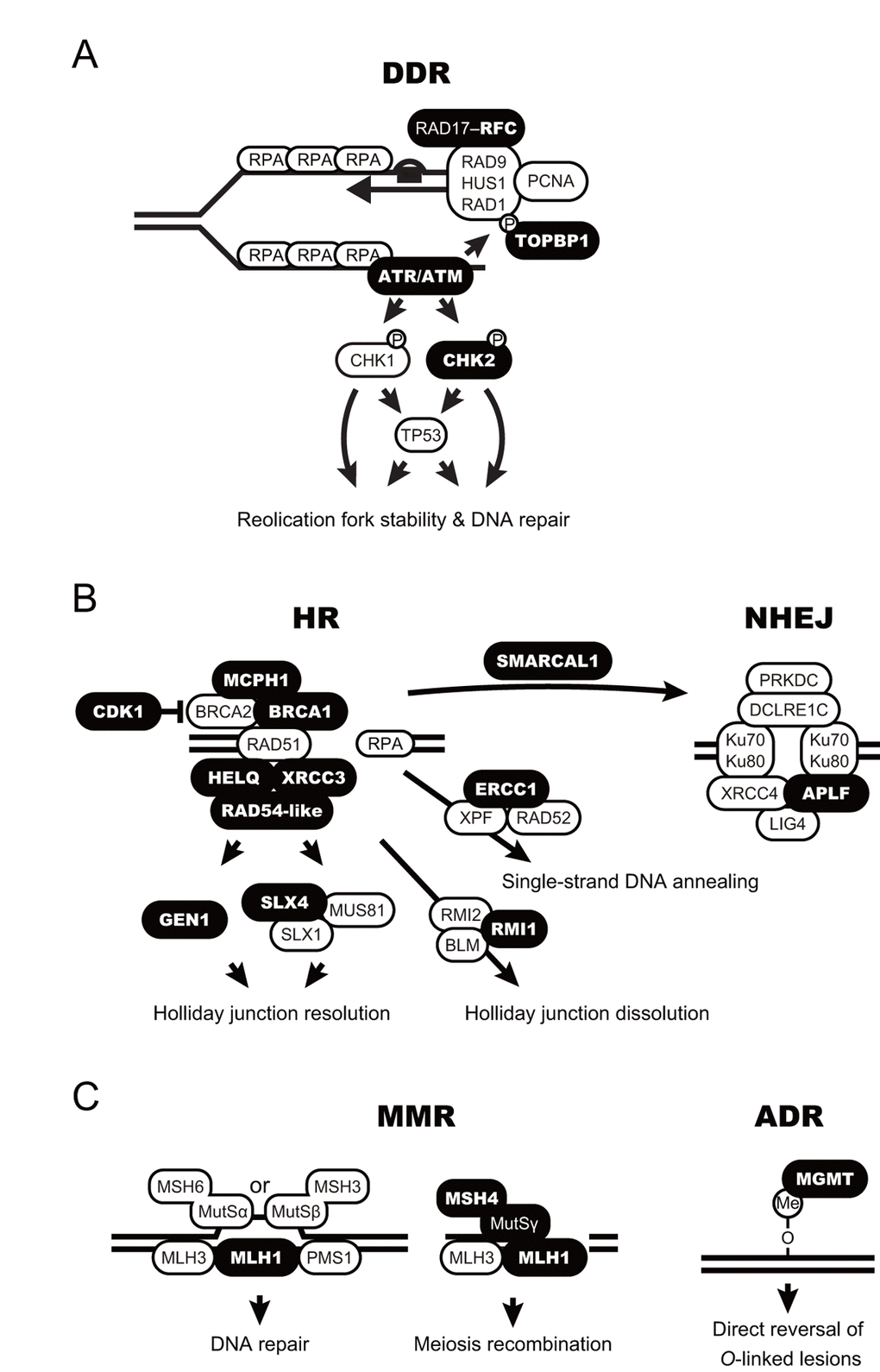 | XRCC3 | X-ray repair cross-complementing protein 3 | HR | |||||||||||||||||||||||||||||||||||||||||||||||||||||||||||||||||||||||||||||||||||||||||||||||||