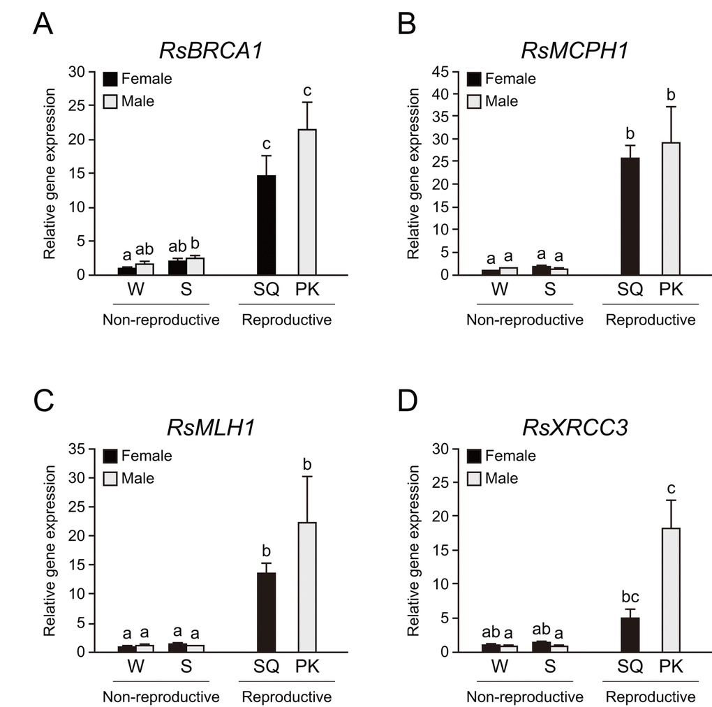 BRCA1, MCPH1, XRCC3, and MLH1 are known to have roles in meiotic progression and the maintenance of genomic stability [32–35]. The germline genome is vulnerable to the accumulation of deleterious mutations during meiotic DNA replication. If those mutations are not eliminated in reproductive cells, errors could be passed to offspring, which is linked to an increased risk of diseases in future generations [36]. Therefore, our findings indicate that strong evolutionary pressures potentially led to the high expression of DNA repair genes in reproductive tissues, especially in the long-lived organisms having the long reproductive periods. Indeed, long-lived humans display lower germline mutation rates than short-lived mice due to high DNA repair gene expression [37]. Additionally, DNA damage levels were lower in long-lived termite queens than in short-lived workers [38]. It is necessary to examine whether mature PKs and SQs have lower levels of DNA damage in reproductive tissues than short-lived species in future research.