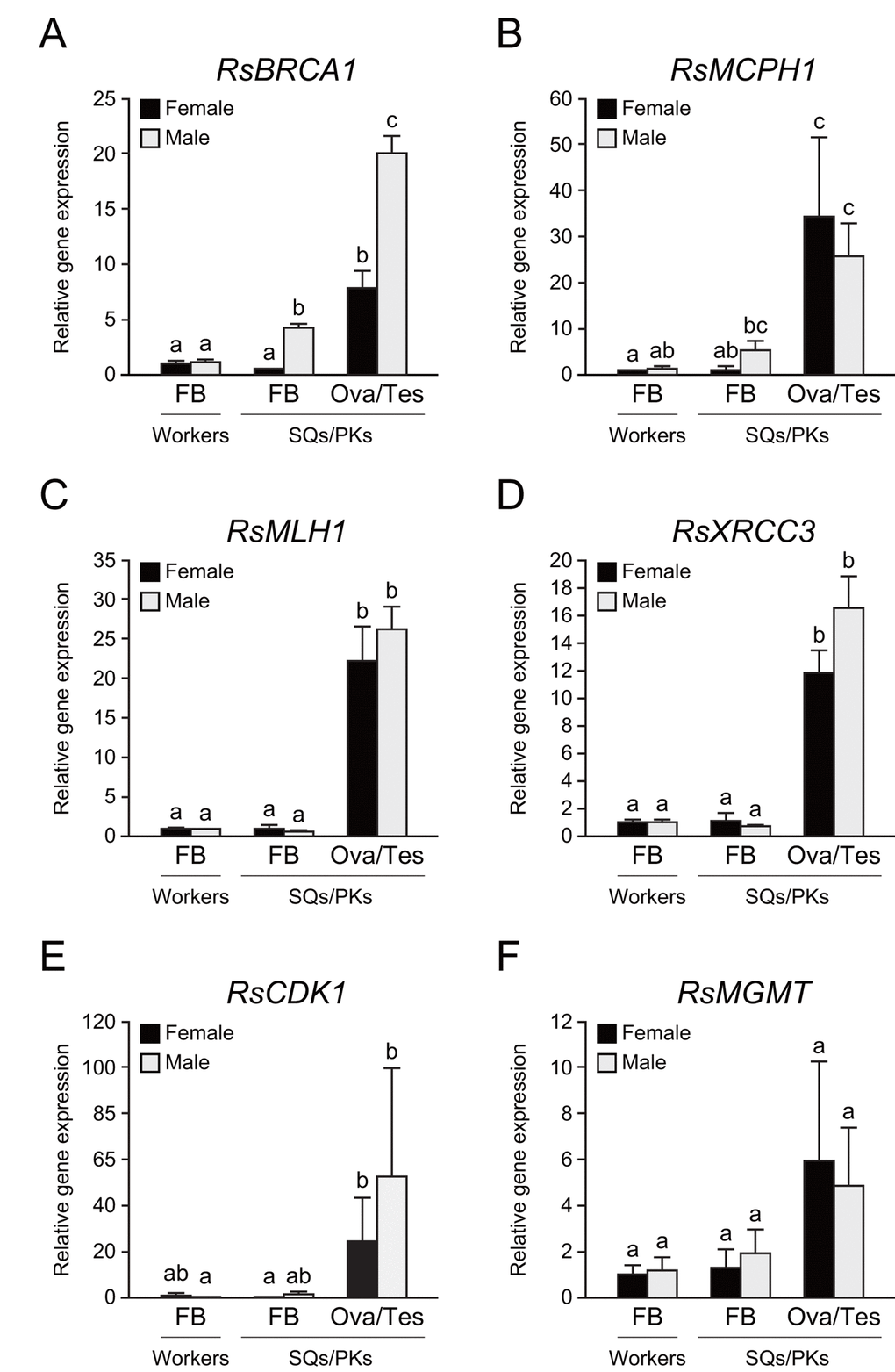To determine whether these repair genes are expressed in the termite body, we performed tissue-specific qPCR analysis in workers and mature reproductives. The testis of PKs displayed the highest RsBRCA1 expression among all termite tissues (n = 6, P < 0.05; Fig. 5A). In addition, the fat body of PKs displayed higher RsBRCA1 expression than that of workers and SQs (n = 6, P < 0.05; Fig. 5A). RsMCPH1 expression was higher in the ovaries and testes than in the fat body except in all castes excluding PKs (n = 6, P < 0.05; Fig. 5B). Meanwhile, RsMLH1 and RsXRCC3 expression was higher in the ovaries and testes than in the fat body (n = 6, P < 0.05; Figs. 5C and 5D). Furthermore, we assessed the expression levels of RsCDK1 and RsMGMT, which are also considered as mature PK-specific genes, and these tended to be higher in the ovaries and testes than in the fat body, but there were no statistically significant differences (n = 6; Figs. 5E and 5F).