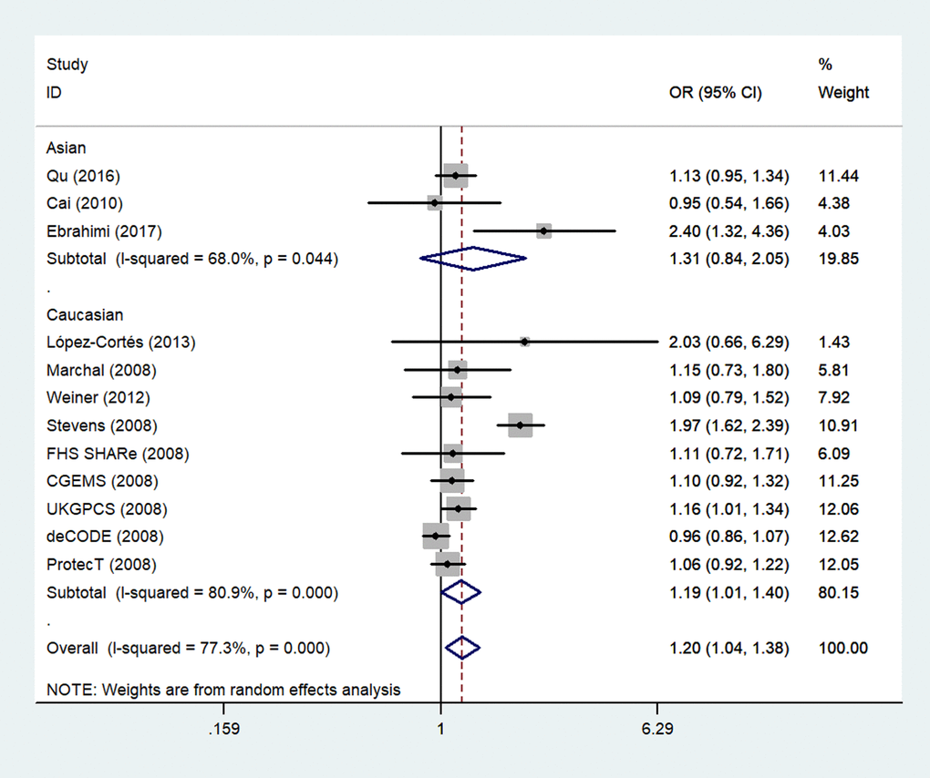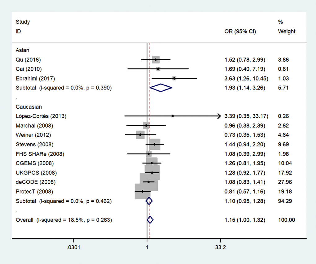 | Caucasian | 9 | 7852/37788 | 1.12(1.00-1.27)0.000 0.052 | 1.19(1.01-1.40)0.000 0.043 | 1.10(0.95-1.28)0.462 0.181 | 1.18(1.01-1.38)0.000 0.042 | |||||||||||||||||||||||||||||||||||||||||||||||||||||||||||||||||||||||||||||||||||||||||||||