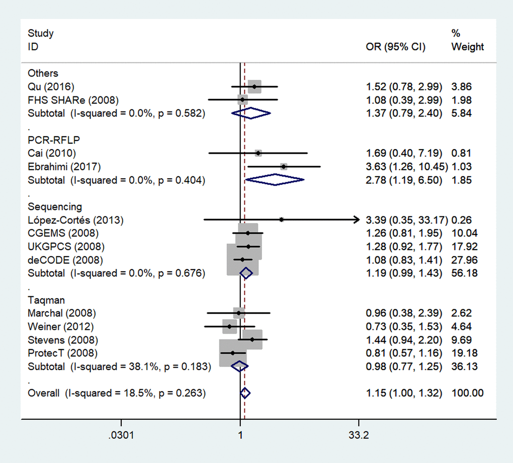 | Taqman | 4 | 2945/3670 | 1.14(0.87-1.49)0.000 0.333 | 1.29(0.90-1.84)0.000 0.172 | 0.98(0.77-1.25)0.183 0.857 | 1.24(0.87-1.77)0.000 0.235 | |||||||||||||||||||||||||||||||||||||||||||||||||||||||||||||||||||||||||||||||||||||||||||||
