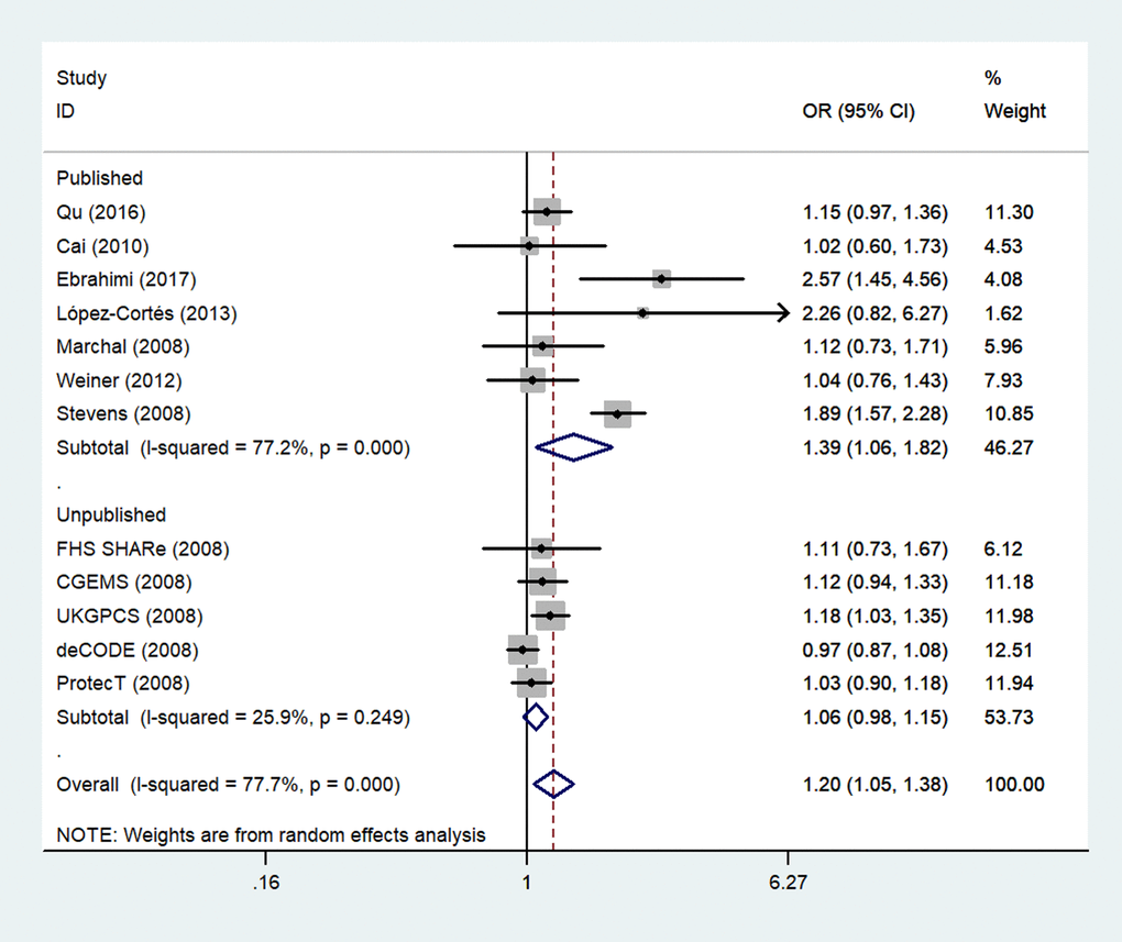 Finally, because five unpublished studies were included, we examined the publication status subgroup. Compared to the unpublished studies, significant associations between rs1805087 genotypes and increased PCa susceptibility were found in published studies (e.g., GG+GA vs. AA: OR = 1.39, 95% CI 1.06–1.82, Pheterogeneity = 0.000, P = 0.017; Figure 7; Table 2).