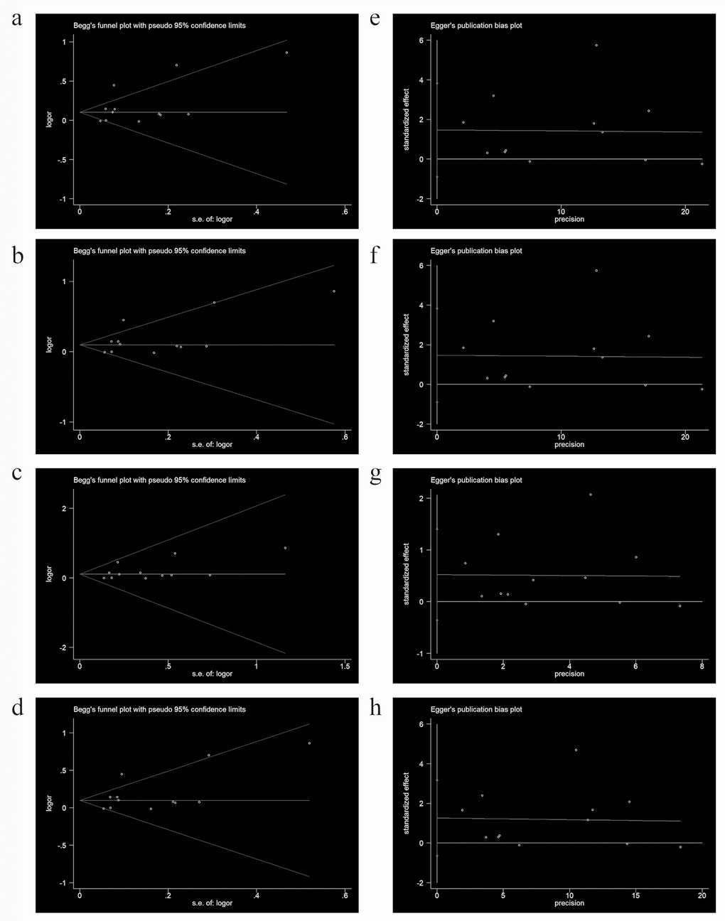 Table 3. Publication bias tests (Begg’s funnel plot and Egger’s test for publication bias test) for METH rs1805087 polymorphism.