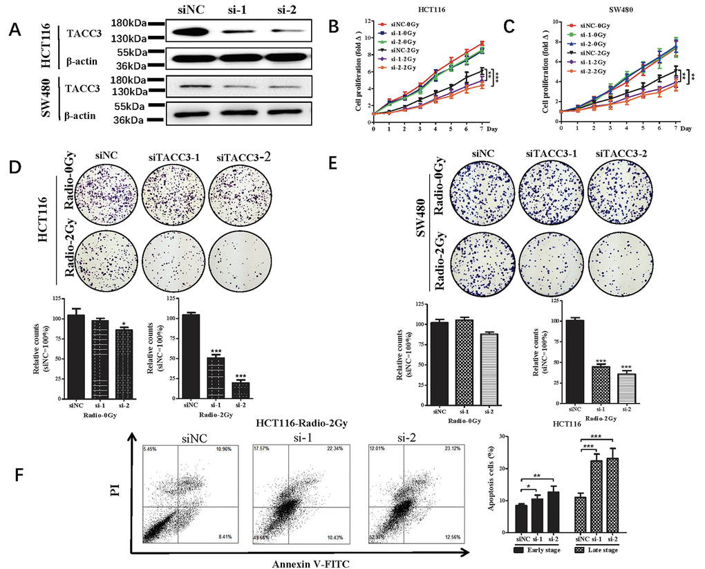 Although the functions of TACC3 in human cancer are unknown, a TACC3-FGFR3 fusion protein has been detected in a subset of glioblastoma multiforme (GBM) [25] and bladder tumor tissues as well as in various cancer cell lines [26]. Other studies have shown that high TACC3 expression enhances the proliferation, migratory/invasive ability and transformation capacity of HeLa cervical cancer cells [27]. In addition, high TACC3 expression is associated with a mesenchymal phenotype, which is typically accompanied by downregulation of the epithelial marker E-cadherin and upregulation of the mesenchymal markers N-cadherin and Vimentin as well as the epithelial-mesenchymal transition (EMT) inducers Snail and Slug [27]. Other studies also demonstrated that TACC3 can be induced by EGF and that EGF-mediated TACC3 induction is dependent on EGFR activation [28]. But although TACC3 expression correlates with poor prognosis, whether TACC3 expression correlates with the response to neoadjuvant chemoradiotherapy remains unknown. In the present study, therefore, we used biopsy samples from rectal cancer patients and colorectal cell lines to assess the relationship between TACC3 expression and CRT sensitivity.