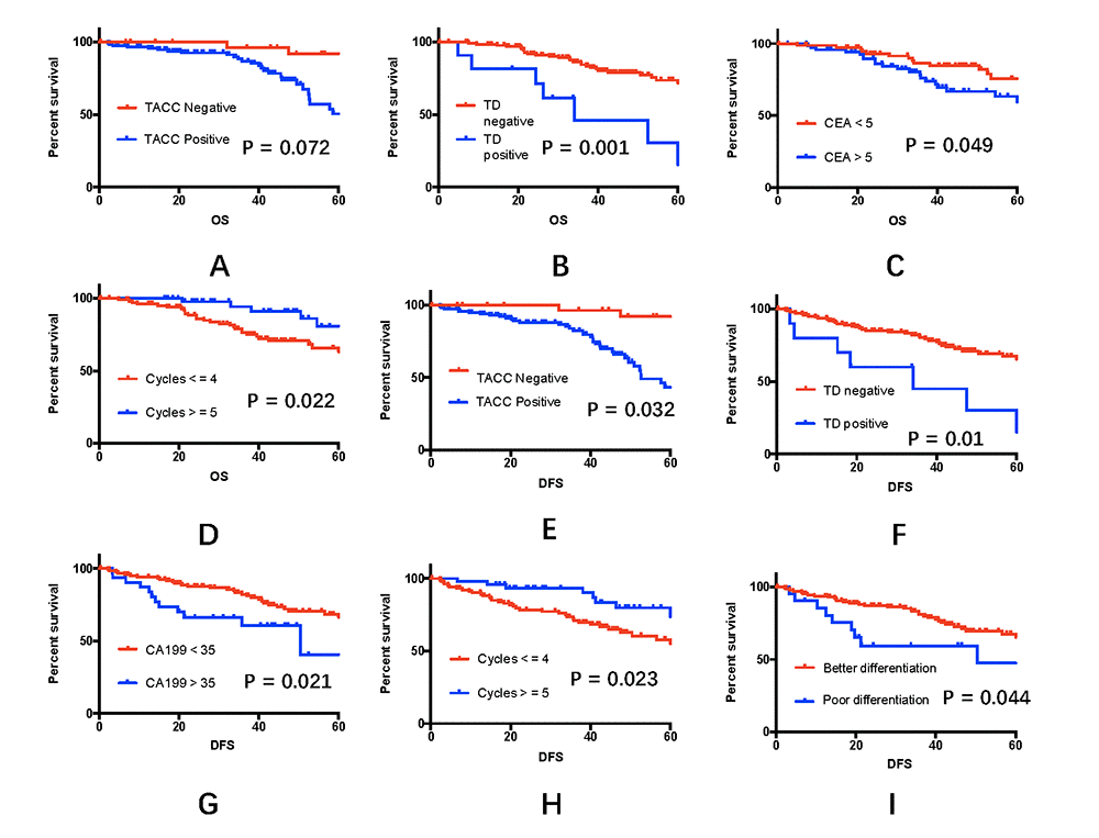 A Cox multivariate analysis revealed that the significant prognostic factors for overall survival were TACC3 expression (RR = 3.714, 95% CI = 1.261–10.93; P = 0.017) and the presence of TDs (RR = 3.084, 95% CI = 1.323–7.190; P = 0.017). The CEA level (RR = 1.008, 95% CI = 1.001–1.015; P = 0.028), TACC3 expression (RR = 3.140, 95% CI: 1.201–8.210; P = 0.020), and the presence of TDs (RR = 2.727, 95% CI = 1.183–6.286; P = 0.019) were significant prognostic factors for disease-free survival. Additional details are presented in Table 3.