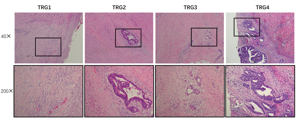 This study used the AJCC TRG system to evaluate patient response to CRT. Tumor regression was classified into four histologic TRGs based on vital tumor tissue and the ratio of fibrosis after CRT: TRG 0, complete regression and the absence of viable cancer cells; TRG 1, the presence of only small clusters or single cancer cells; TRG 2, the presence of residual cancer cells with predominant fibrosis; and TRG 3, minimal or no decrease in the tumor cells or extensive residual cancer (Figure 5). Patients classified as TRG 0 or 1 were considered chemotherapy responders, while those classified as TRG 2 or 3 were chemotherapy non-responders.
