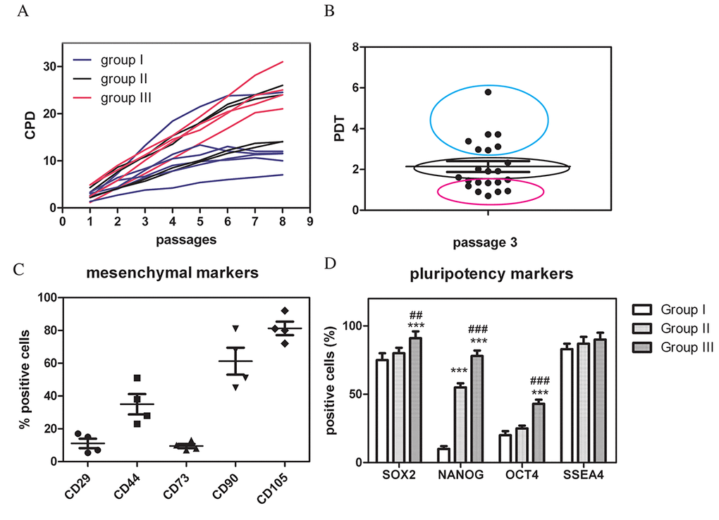 A potential marker of the senescent state of stem cells may be also a decreased expression of pluripotency transcription factors, such as Nanog, Sox2, SSEA4, and Oct4 [24]. Therefore, to confirm stem cell origin of AFSCs, we performed cytofluorimetric analysis of the main transcription factors from AF samples with slow (group I, n = 3), middle (group II, n=3) and high (group III, n = 3), proliferation (Fig.1D). Sox2 and SSEA4 were expressed at a quite similar level in all AFSC samples, while the expression of Oct4 and Nanog were much lower in slow samples (group I).