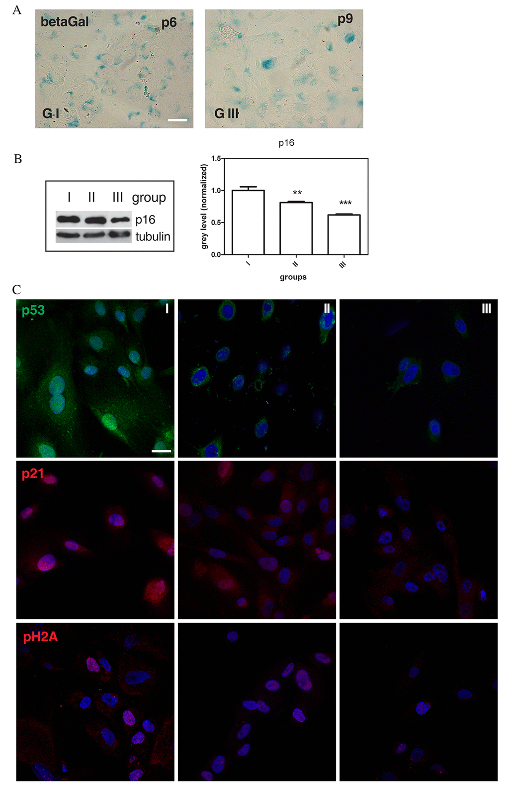 Several biomarkers have been used for quantitative assessment of cell senescence, including senescence-associated 𝛽-galactosidase (SA-𝛽 gal) and the cyclin-dependent kinase inhibitors, p16INK4A and p21WAF1, that are involved in the control of growth arrest by two major tumour suppressor pathways, p16INK4A/pRb and p53/p21WAF1 [25,26]. As shown, during passaging of cell cultures derived from different AF donors, AFSCs cultures differently stop their growth in the course of cultivation. In fact, we observed that AFSCs senescence was accompanied by typical morphological changes and cells became enlarged and flattened, with enhanced SA-𝛽-gal activity (Figure 2A), while stem cell marker expression decreased, as reported for Oct4, as a representative marker, in Supplementary Figure S1. These senescence-associated changes occurred later in AFSCs samples that showed a relatively faster level of proliferation. Indeed, at early passages a slight more intense positivity for SA-𝛽-gal activity is more evident for group I than group III (Supplementary Figure S2), while the same amount (about 70%) of SA-𝛽-gal-positive cells was detected in groups I and III at p6 and p9 (denoted as late passage), respectively.
