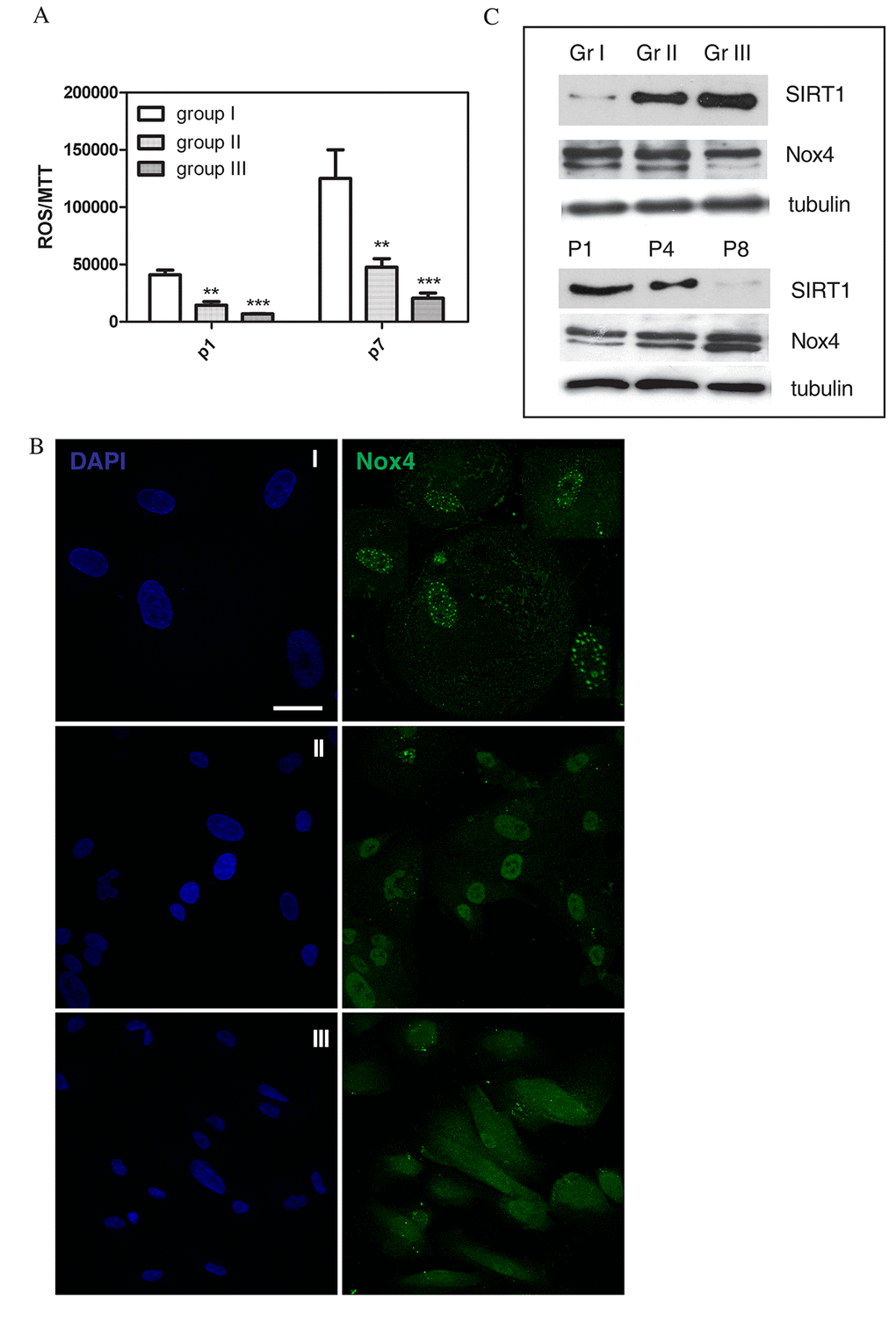 Sirtuins are a class of NAD+-dependent protein deacylases with important implications in aging [28]. Humans have 7 sirtuins (SIRT1–7) with distinct subcellular localizations and functions. The regulatory role of Sirtuin 1 (SIRT1) is predominantly linked to p53 activity. Interestingly, its activation in aged cells protects the cells from p53-dependent apoptosis or senescence [29]. It was found that oxidative stress regulates these sequences and promotes shuttling of SIRT1 [30,31]. Here we found that samples of group I have an expression of SIRT1 much lower than group III, and the effect of culture passaging is a decrease of SIRT1 expression, as expected (Fig. 3C).
