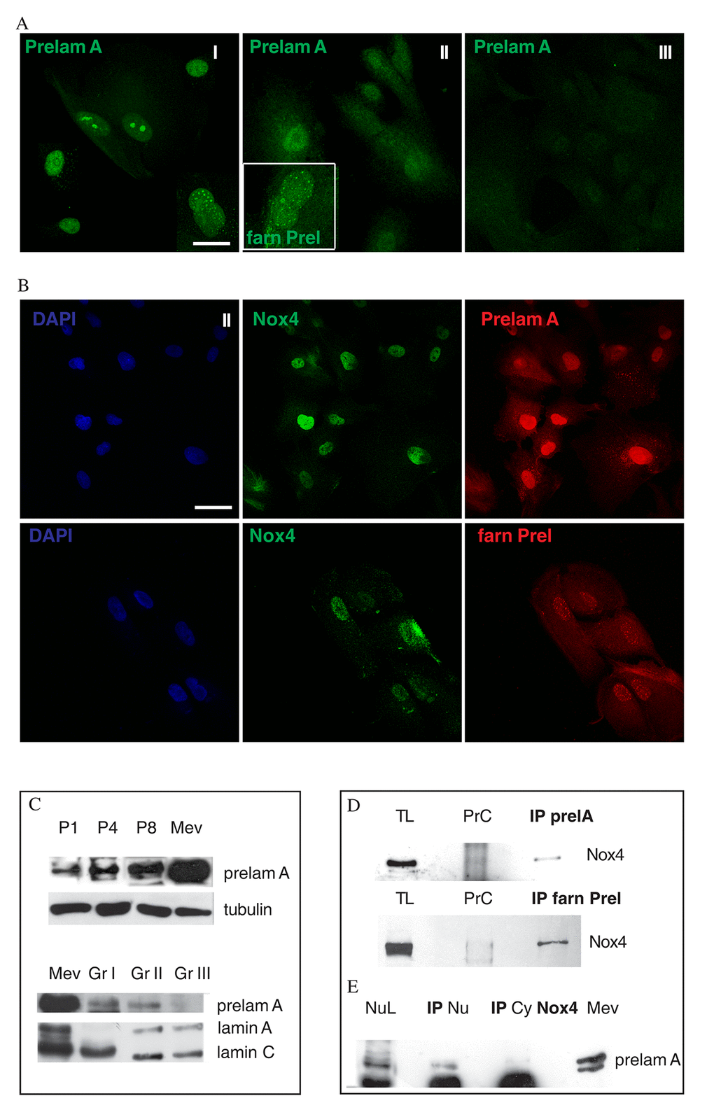 This interaction was confirmed by immunoprecipitation of nuclear lysates with anti-Nox4 antibody, detected for anti-prelamin A, as shown in Figure 4E.