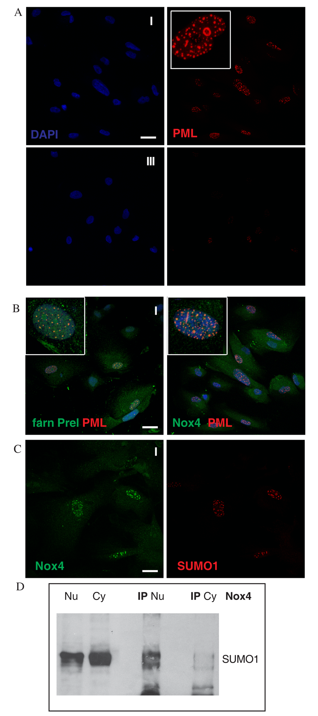 Western blot using SUMO1 antibody in Nox4 immunoprecipitated nuclear or cytoplasm lysates revealed that nuclear Nox4 is directly linked to SUMO1 or through another sumoylated protein with 74 kDa molecular weight, such as prelamin A (Fig. 5D), corroborating Nox4 localization within PML-NBs.
