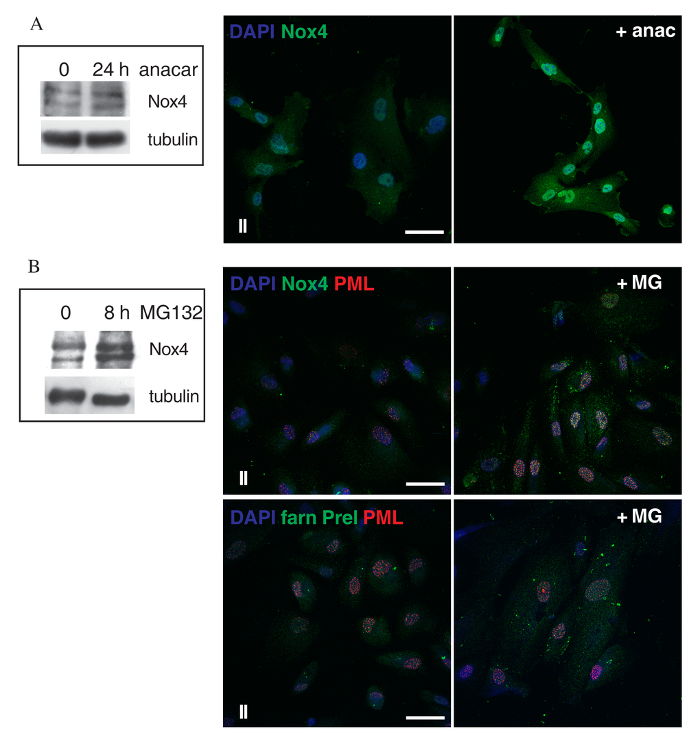 To determine whether proteasome inhibitors may influence the levels of nuclear Nox4, we performed treatment with MG132, an inhibitor of the proteasome pathway, and investigated Nox4 expression by Western blot and localization by immunofluorescence. Figure 6B indicates that MG132 induced an increase in Nox4 levels both in the cytoplasm but also into the PML nuclear foci. Since it has been demonstrated [35] that the effect of MG132 in Hutchinson-Gilford progeria syndrome (HGPS) fibroblasts unexpectedly resulted in a decrease of progerin staining intensity, instead of increasing progerin levels, we carried out immunofluorescence experiments for farnesylated prelamin A. As shown in Fig.6B, 8-h treatment with MG132 induced the formation of large farnesylated prelamin A and PML intranuclear foci, not a decrease.