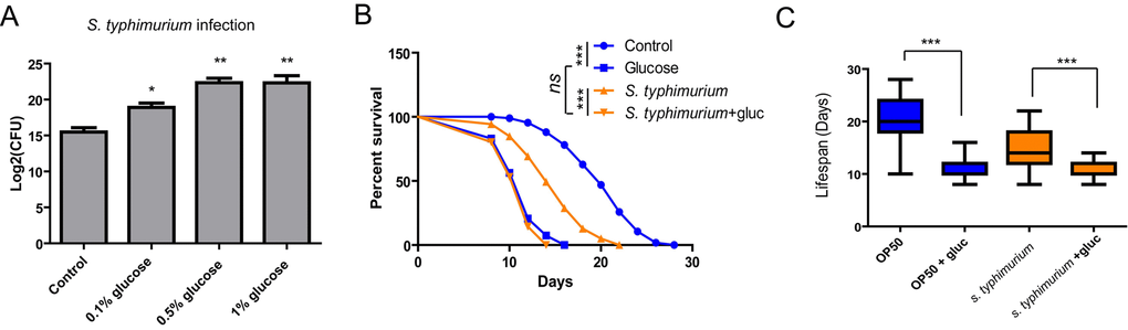 As infection is highly associated with survival rate, we determined if glucose would affect survival of animals after infection by pathogen S. typhimurium. After infection, we transferred the animals to normal NGM plate with non-pathogenic OP-50 bacteria and recorded survival every other day until the worms were all dead. Consistent with the enhanced infection in Fig. 1A, glucose supplementation decreased survival rate of worms infected by S. typhimurium. Glucose also shortened the lifespan of C. elegans in the non-pathogenic bacteria such as OP-50 (Fig. 1B), as has been reported by several studies before [3-5]. Both S. typhimurium and glucose shortened lifespan of C. elegans in a non-additive manner (Fig. 1C).