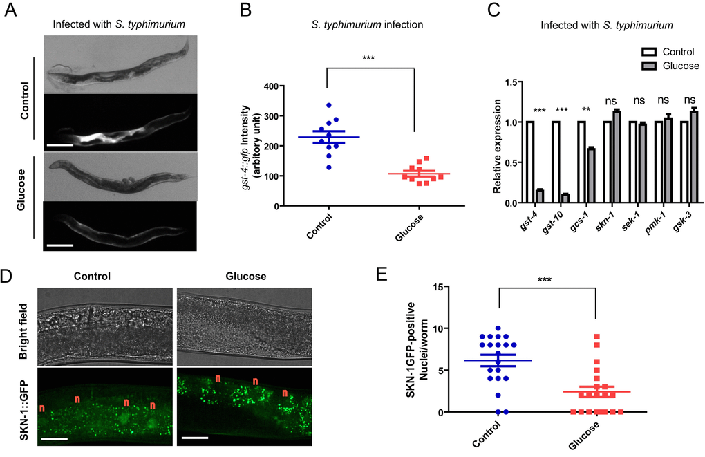 Second, we tested the expression of several Nrf-2 target genes (gst-4, gcs-1 and gst-10) by qRT-PCR. Consistently, induction of these SKN-1 target genes by S. typhimurium was suppressed when glucose was presented in the culture medium (Fig. 2C). Without induction by S. typhimurium infection, gst-4 expression was low and not affected by glucose (Fig. S2), consistent with the gst-4::gfp reporter in Fig. S1. Expression of genes encoding skn-1 and upstream kinase such as sek-1, pmk-1 and gsk-3 were not affected by glucose (Fig. 2C), suggesting that the mRNA levels of upstream regulators were not affected (Fig. 2C). Third, we examined the subcellular localization of SKN-1/Nrf2 protein under high glucose conditions. Transcription of SKN-1/Nrf2 target genes requires the accumulation of SKN-1/Nrf2 in the nucleus upon infection [18]. We found that glucose strongly attenuated the accumulation of SKN-1::GFP in the intestinal cells of C. elegans (Fig. 2D and 2E). Therefore, glucose targets SKN-1/Nrf2 to impair immune response to S. typhimurium in C. elegans.