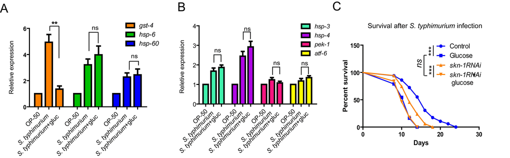 We also tested if other pathogen defense pathways were affected by glucose. The mitochondrial unfolded protein response (UPRmit) and the endoplasmic reticulum unfolded protein response (UPRER) are key stress responses that are also induced upon certain pathogen infection [30,31]. We asked if S. typhimurium could induce similar responses and how they were affected by glucose. To this end, we examined several downstream genes in these two pathways by qRT-PCR. The expression of hsp-6 and hsp-60 genes are well established markers for UPRmit [32], while hsp-3, hsp-4, pek-1 and atf-6 are key genes involved in UPRER [33]. We found that hsp-6, hsp-60, hsp-3 and hsp-4 were significantly increased in expression upon infection by S. typhimurium. However, for all these genes, we detected no significant difference between worms cultured with and without glucose (Fig. 3A and 3B). These data suggest that the glucose specifically targets SKN-1 pathway to affect immune response in C. elegans.