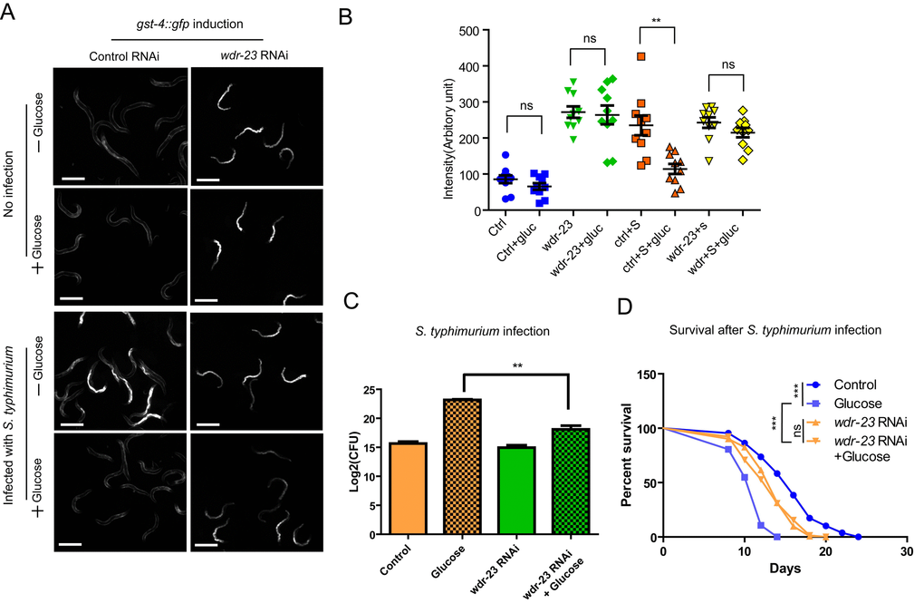 We then evaluated the biological significance of wdr-23 knockdown by examining directly the infection degree through colony assay. Our results showed that the negative effect of glucose on infection was significantly mitigated by wdr-23 knockdowns (Fig. 4B). Furthermore, upon wdr-23 knockdowns, glucose’s negative effect on survival in the presence of S. typhimurium was prevented (Fig. 4C and Fig. S3), suggesting that forced activation of SKN-1 could be sufficient to reverse hyperglycemia -induced infection. In the absence of Salmonella. typhimurium, however, wdr-23 RNAi showed no interaction with glucose (Fig. S3). These results suggest that glucose enhances the pathogen killing effect through WDR-23.