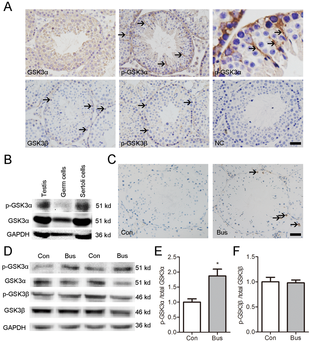 To elucidate the effect of apoptotic GCs on the Ser21 phosphorylation of GSK3α, we treated mice were treated with busulfan. In line with a previous report, massive apoptotic spermatogenic cells appeared in busulfan treated testis at posttreatment d14 (Fig 1C). The level of p-GSK3α (Ser21) and ratio of p-GSK3α/total GSK3α were higher in busulfan treated testis compared to control (Fig. 1D-E). Moreover, no significant difference was found in the levels of p-GSK3β and total GSK3β as well as the rate of p-GSK3β/GSK3β between groups (Fig. 1D, F). In summary, these data collectively suggest an association between apoptotic GCs and Ser21 phosphorylation GSK3α in SCs.