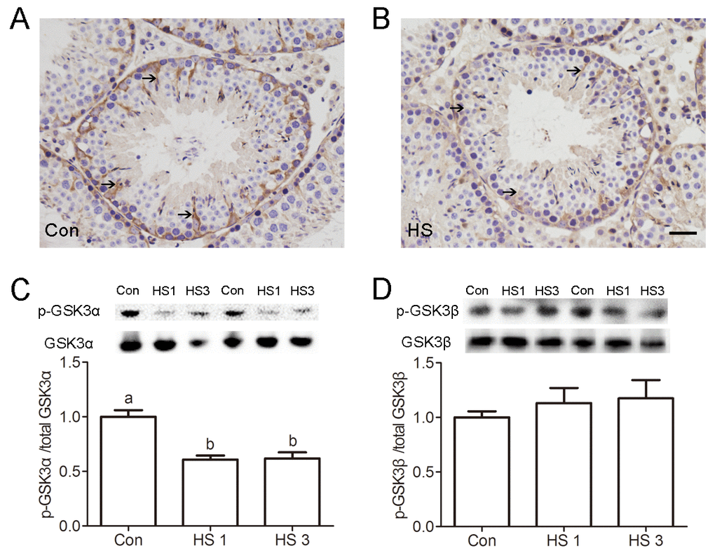 Then, a mouse model we developed to investigate whether GSK3α inactivation is required for the clearance of apoptotic GCs. After a single, mild, transient scrotal HS, p-GSK3α (Ser21) was found to have decreased in SCs was reduced (Fig. 2A-B). Furthermore, the levels of p-GSK3α (Ser21) and total GSK3α were detected via Western blot. The levels of p-GSK3α (Ser21) were lower in HS-treated testis compared to control (Fig. 2C). There was no significant difference in levels of p-GSK3β (Ser9) and total GSK3β as well as in the rate of p-GSK3β/GSK3β between groups (Fig. 2D).