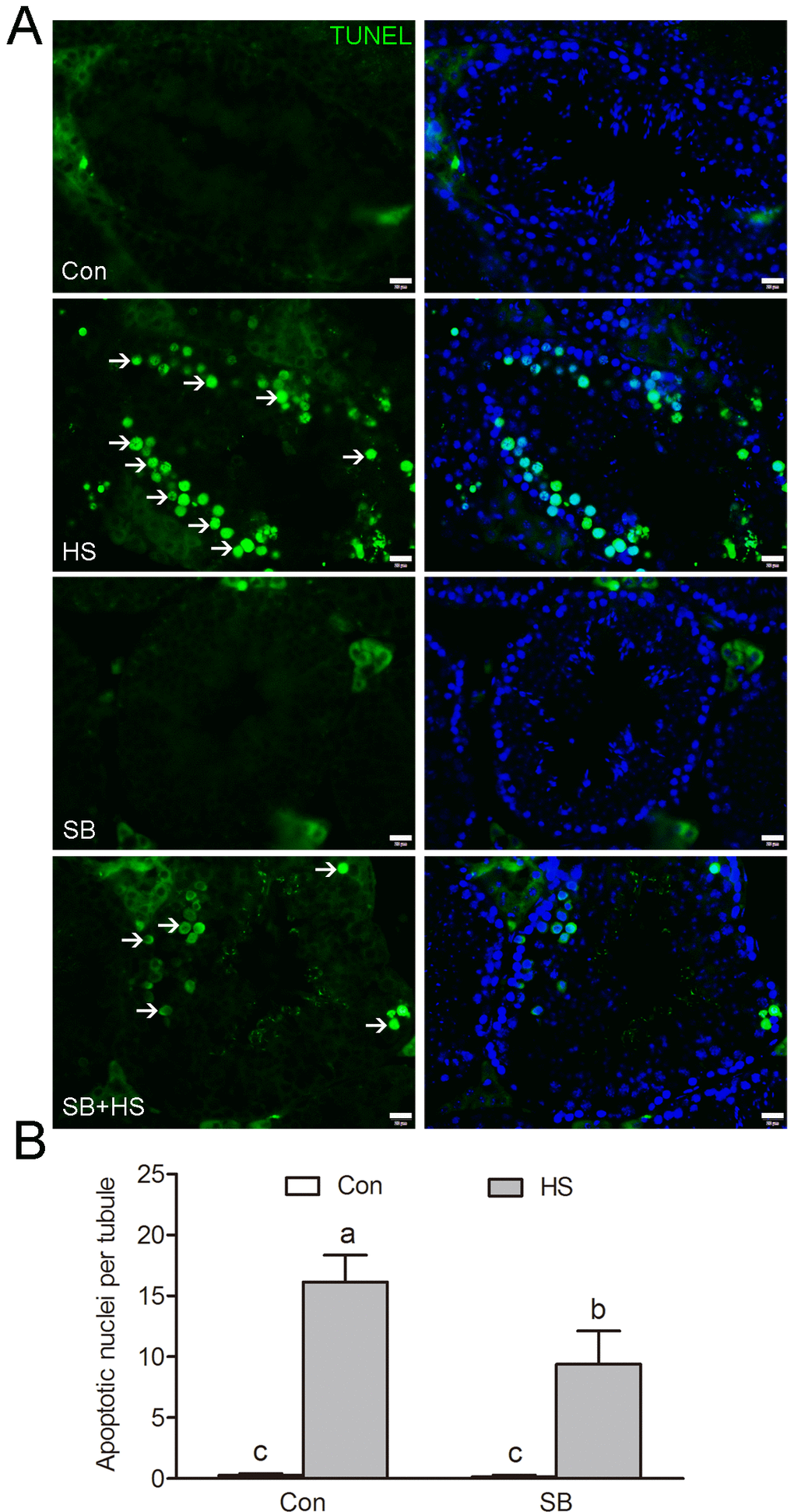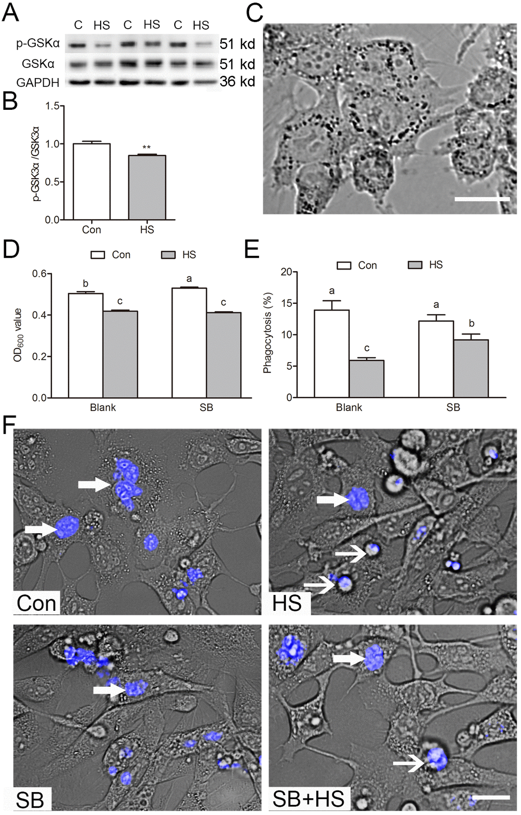 Efficient phagocytic clearance of apoptotic GCs by adjacent SCs is central for functionally mature spermatogenesis. To test the effects of GSK3α ablation on testicular phagocytic activity, mice were treated with a GSK3α inhibitor, SB216763 through the caudal vein. Histological examinations shows a significantly lower number of apoptotic germ cell nuclei in SB216763 treated mice compared to HS-treated mice (Fig. 3A-B). In summary, these data confirmed the potential that GSK3α inactivation was associated with testicular phagocytosis.