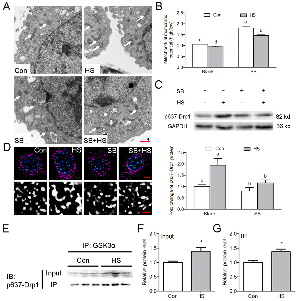 Morphological examination showed that mitochondria in HS-treated cell were more longer while control cells maintained predominantly round mitochondria (Fig.5A, D). Recently, Wang et al. demonstrated that the uptake of multiple apoptotic cells by macrophages requires Drp1-mediated mitochondrial fission [7]. Phosphorylation of Drp1 at Ser637 could inhibit the translocation of Drp1 to mitochondria and thus block mitochondrial fission [12]. Here, Drp1 phosphorylation at Ser637 was observed to be significantly increased in GSK3α activated TM4 cells (Fig. 5C). Moreover, the increase of phosphorylation at Ser637 induced by HS can be blocked by SB216763 (Fig. 5C). Co-immunoprecipitation analysis showed that GSK3α interacted with Ser637-Drp1 (Fig. 5E-G). In summary, these results indicated that GSK3α activation inhibits mitochondrial fission via phosphorylation of Drp1 at Ser637.