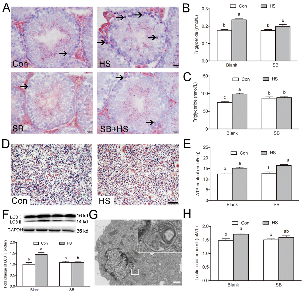 Phagocytosis of apoptotic GCs results in the formation of lipids, which are further metabolized to produce ATP in SCs. The deregulated metabolism of lipid droplets is the hallmark of disrupted SC function [2]. A population of small lipid droplets, located in the area of the epithelium faces, the lumina of most of the tubules (i.e., mostly extracellular) after HS (Fig. 6A). Biochemical tests confirmed the increase of the triglyceride content in the testis (Fig. 6B). In vitro studies found that GSK3α activation resulted in significant increases of triglyceride content (Fig. 6C) and lipid droplets in TM4 cells (Fig. 6D).