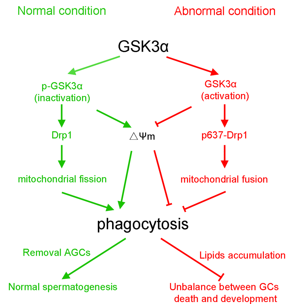Taken together, our results demonstrate that inactivation of GSK3α is required for mitochondria-mediated apoptotic GCs phagocytosis in SCs. GSK3α activation participates in decrease of mitochondrial activity and in altering the mitochondrial structure. Specifically, GSK3α activation inhibits mitochondrial fission via phosphorylation of Drp1 at Ser637. Changes of mitochondria resulted in the accumulation of lipid droplets and the alteration of the metabolic pattern of SCs. Together, the obtained results indicate that the normal occurrence of SC phagocytosis requires phosphorylation of GSK3α at Ser21. The results provide new insights for the understanding of the underlying mechanisms of phagocytic clearance of apoptotic spermatogenic cells by SCs during spermatogenesis.