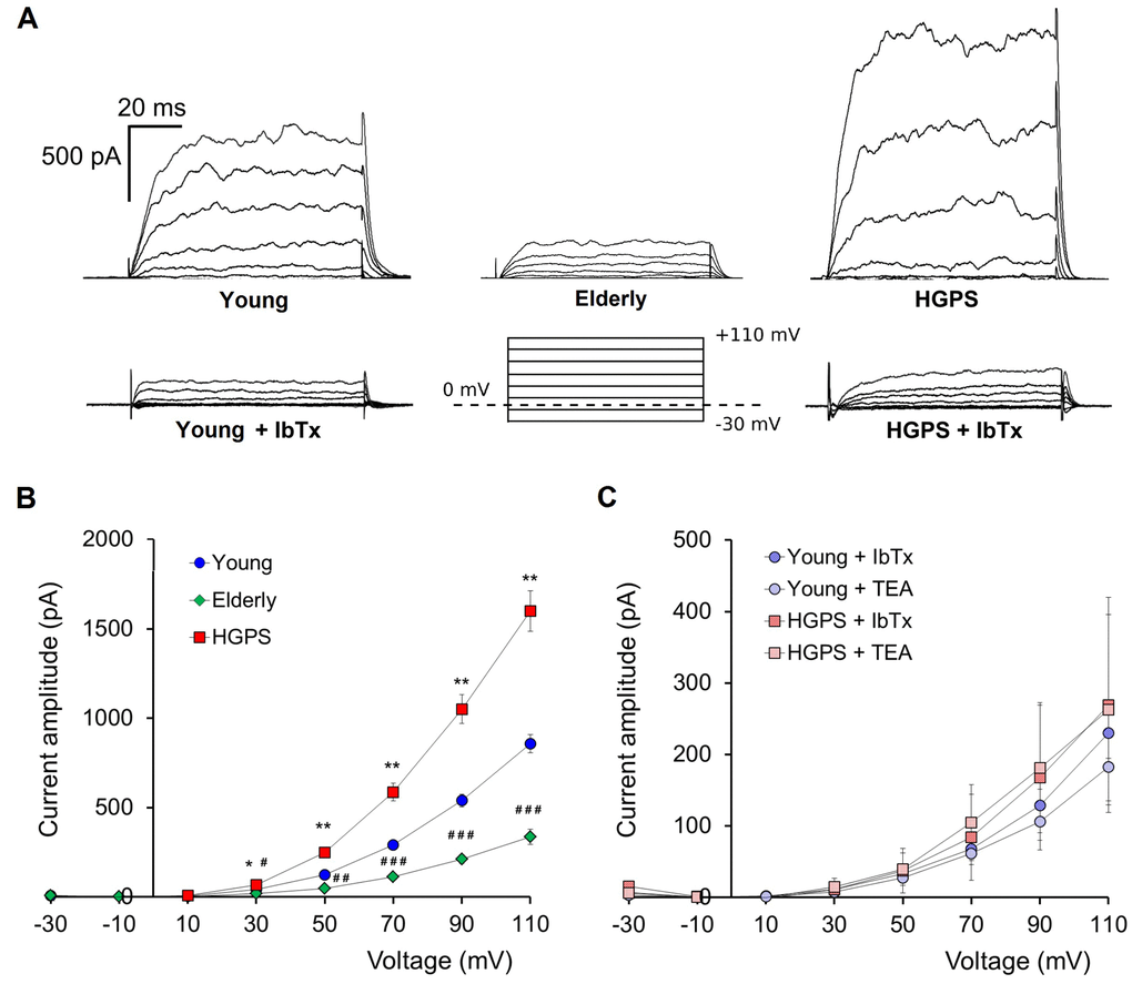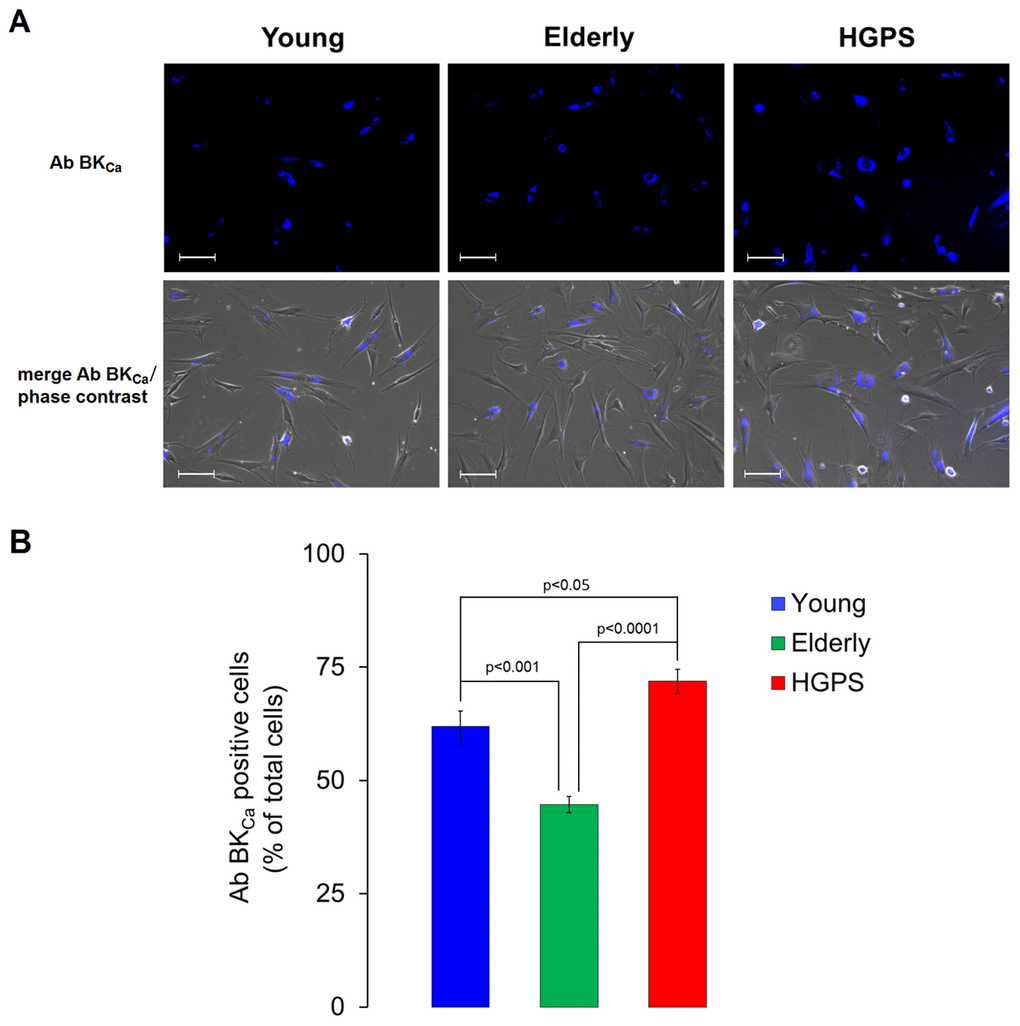 Based on the whole evaluation of electrophysiology and immunofluorescence results, it can be claimed that the increase of the whole-cell outward current for the HGPS group compared to the Young can be mainly ascribed to a BKCa channels overexpression on plasma membrane rather than an increment of their activity Ca2+ -modulated. Interestingly, this phenomenon does not occurs during the physiological process of aging, since hDF obtained from elderly subjects are conversely characterized by a decrease in BKCa channels expression on plasma membrane and intracellular Ca2+ concentration.