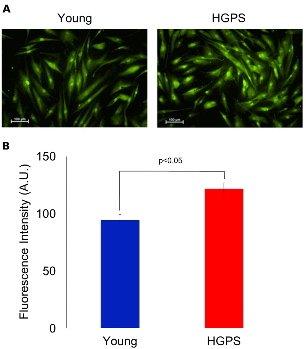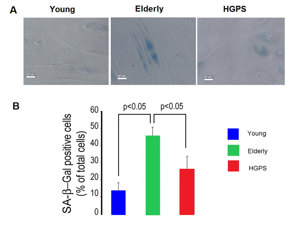 Fibroblasts grown on coverslips were fixed with 2% formaldehyde/0.2% glutaraldehyde for 3 minutes at 22°C and incubated overnight at 37°C in 1 mg/mL 5-bromo-4-chloro-3-indolyl-β-D-galactoside (X-Gal), 40 mM citric acid-sodium phosphate, 5 mM potassium ferricyanide, 5 mM potassium ferricyanide, 150 mM NaCl and 2 mM MgCl2. The percentage of hDF with blue staining (positive for SA β-gal activity) has been calculated counting the number of cells from Young, Elderly and HGPS groups present in images acquired in transmission light bright field at 400× magnification from three independent staining.