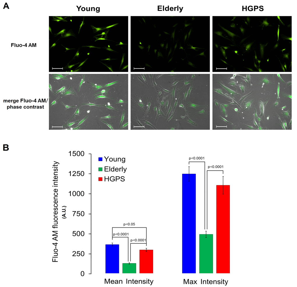 Immunofluorescence staining for the BKCa channels expressed on plasma membrane was also performed in living cells. Living fibroblasts adhered in monolayer culture from Young, Elderly and HGPS groups were double labeled by using the custom synthesized rabbit polyclonal IgG specific to the extracellular amino acids residues KCNMA1-69:86 conjugated with Alexa Fluor 350 (Invitrogen, Life Technologies Europe, Milano, Italy), and the cell-permeant calcium (Ca2+) fluorescent probe Fluo-4 AM (Thermo Fisher Scientific Inc., Waltham, MA, USA). Supplemented DMEM solution (500 μl) containing the conjugated primary antibody diluted 1:500 and Fluo-4 AM at concentration 2 μM were added to each well of the imaging 24-well plate. The plates were kept in incubator for 2 hours and then washed three times with DMEM at 37°C. Right after, images were acquired with the appropriate fluorescence filters (DAPI and FITC), and with phase contrast microscopy at 200× magnification.