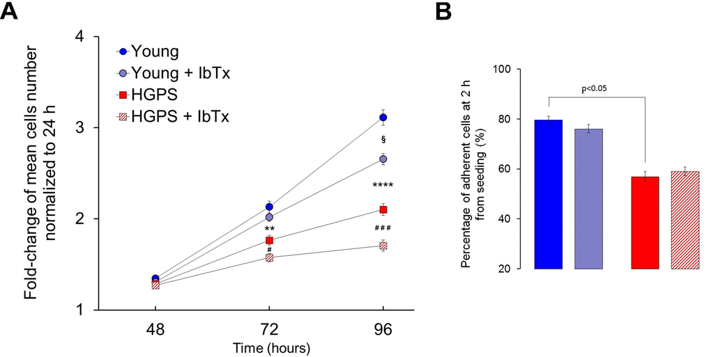 The proliferation rate of hDF obtained from the Young and HGPS groups has been assessed by counting the number of cells at 24, 48, 72 and 96 hours from seeding. The fold-change of the mean number of cells normalized to the first 24 h is reported in Figure 5A. The statistical evaluation of results indicates that replication rate is significantly reduced in HGPS cells compared to Young at 72 h (p<0.001) and at 96 h (p<5×10-7). Since the adhesion process is a necessary step towards proliferation (a lower capability to adhere cause a reduction in the number of the initially seeded population), the same population of cells from the Young and HGPS groups was monitored two hours after seeding. The analysis revealed that the percentage of adherent HGPS hDF is about 20% lower (p <0.05) compared to that obtained from the Young group (Fig. 5B). To account whether BKCa channels are involved in the process, we performed cell growth and adhesion experiments keeping cells in replicative conditions from 0 to 96 hours in the presence or not (treated or untreated cells) of 100 nM IbTx. The statistical analysis showed that the proliferation rate of Young and HGPS cells in comparison to that of same-group untreated cells at 72 h from seeding is significantly lower only for the HGPS group (p<0.01), while at 96 h it is for both groups with p values of <0.01 for the Young group and <0.0001 for the HGPS one (Fig. 5A). Conversely, the adhesion capability of HGPS cells is not significantly affected by the BKCa channels block (Fig. 5B). Therefore, the inhibition of BKCa channels activity by the specific toxin IbTx negatively affects only the proliferation rate and the effect seems to be more consistent in HGPS cells compare to those Young.