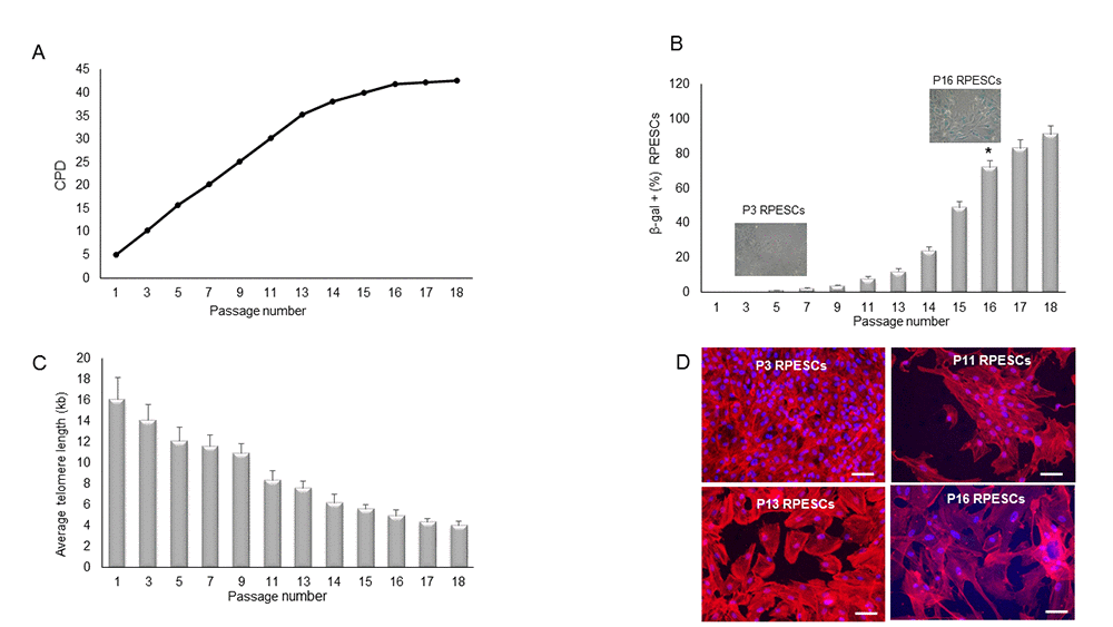 Altogether, the present findings indicate that RPESCs can undergo replicative senescence, which affects their proliferation and differentiation ability. In addition, senescent RPESCs acquired the SASP, which probably compounds the inflammatory RPE microenvironment during AMD development and progression. A greater understanding of the role of RPESCs in AMD pathogenesis is needed to find means to control the disease and modulate its progression.
