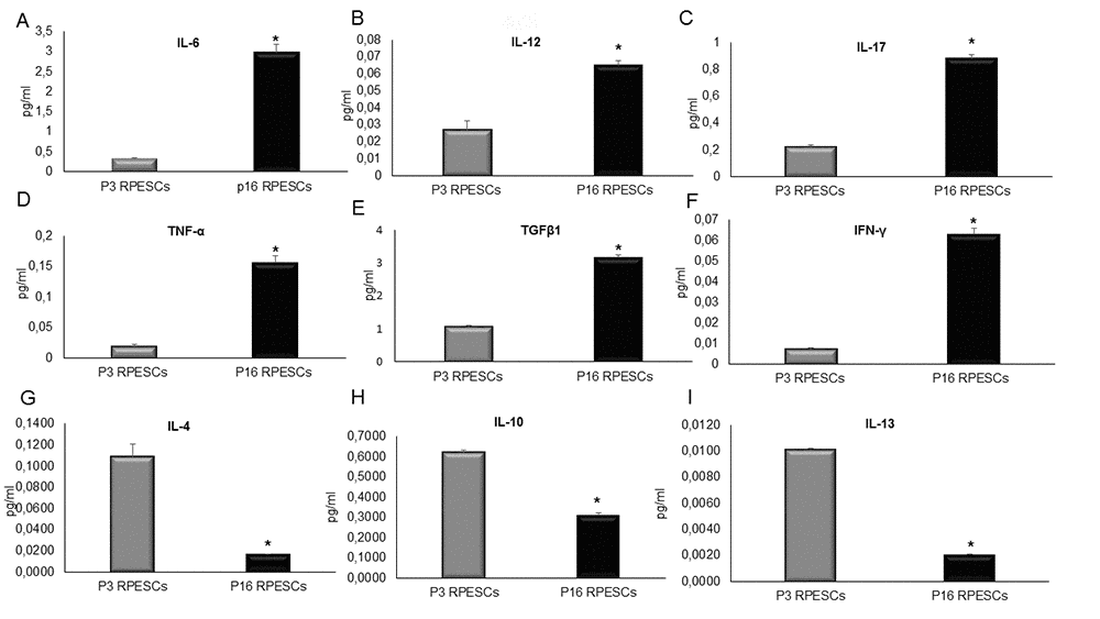 SASP acquisition by senescent REPSCs was determined by analyzing a panel of proinflammatory molecules: interleukin (IL)-6, interferon (INF)-γ, TNF-α, IL-12, and transforming growth factor β (TGFβ)1 - in young (P3) and senescent (P16) RPESCs. The analysis was extended by determination of the levels of the anti-inflammatory molecules IL-4, IL-10, and IL-13.