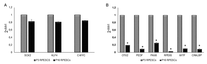 The expression of RPE-specific (OTX2, PEDF, PAX6, RPE65, MITF, and CRALBP), stemness, and reprogramming (SOX2, KLF4 and c-MYC) genes was investigated in young and senescent RPECS by qRT-PCR.