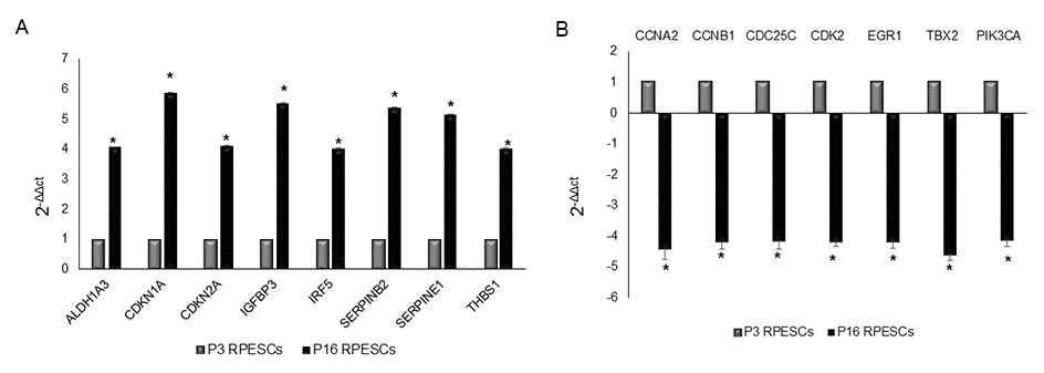Fifteen genes related to human cellular senescence were differentially expressed and showed a 4-fold change in senescent compared to young RPESCs: 8 genes, ALDH1A3 (aldehyde dehydrogenase 1 family member A3), CDKN1A (cyclin-dependent kinase inhibitor 1A, p21), CDKN2A (cyclin-dependent kinase inhibitor 2A, P16INK4), IGFBP3 (insulin-like growth factor binding protein 3), IRF5 (interferon regulatory factor 5), SERPINB2 (serpin family B member 2, PAI2), SERPINE1 (serpin family E member 1, PAI1), and THBS1 (thrombospondin 1), were upregulated (Figure 4A), whereas 7 genes, CCNA2 (cyclin A2), CCNB1 (cyclin B1), CDC25C (cell division cycle 25C), CDK2 (cyclin-dependent kinase 2), EGR1 (early growth response 1), TXB2 (T-box 2), and PIK3CA (phosphatidylinositol-4,5-bisphosphate 3-kinase catalytic subunit alpha), were downregulated (Figure 4B).