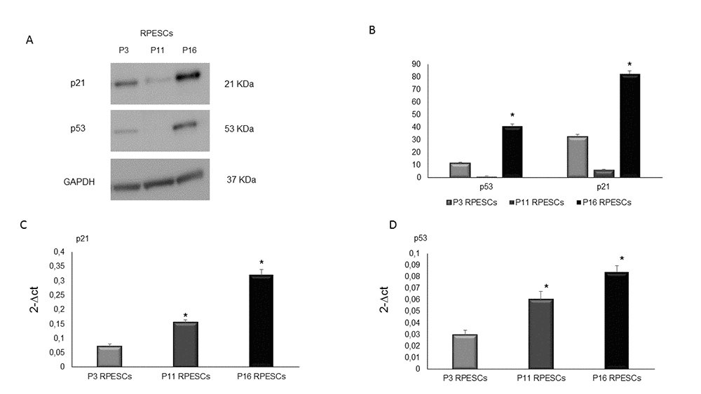 p21 and p53 protein expression in young and senescent RPESCs