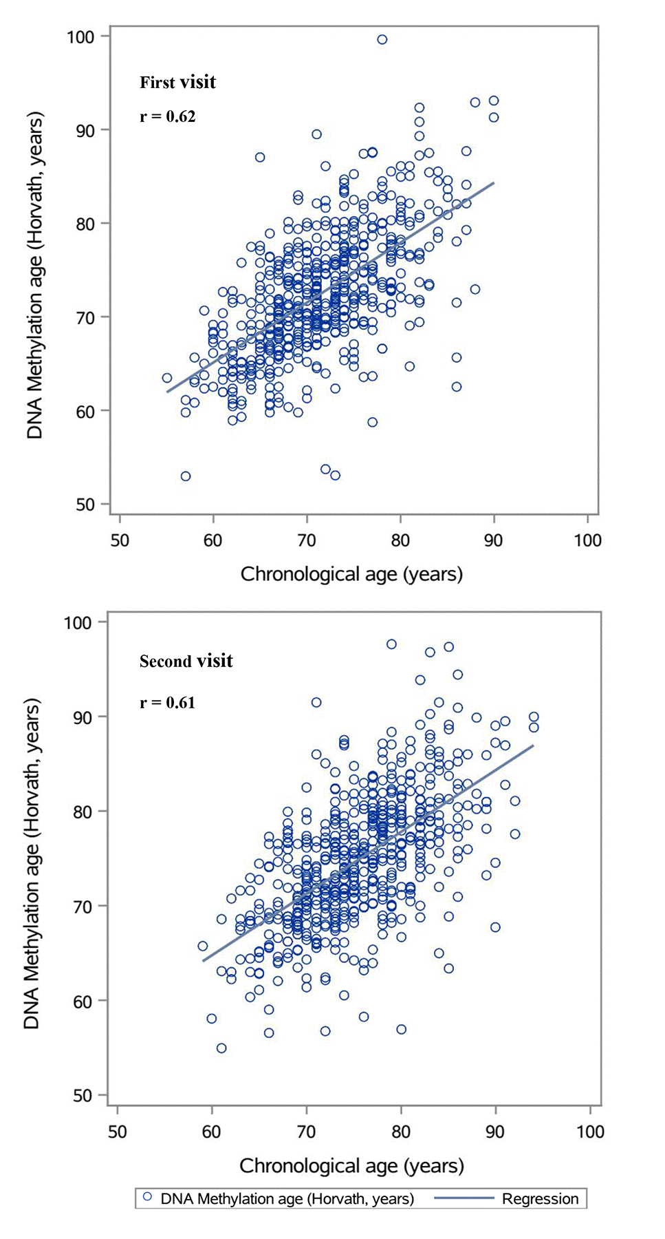 Study population of each visit was described with respect to major socio-demographic characteristics, lifestyle factors and detailed AHM use. The correlation between estimated DNAmAge and chronological age at each visit was evaluated by Spearman correlation coefficient.