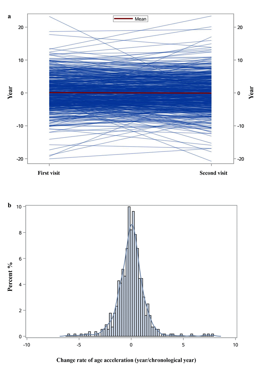 | a: Model 1: Adjusted for covariates at each visit: age + leukocyte distribution (Houseman algorithm) + random effect (batch effect of DNA methylation measurement). Age acceleration was additionally adjusted for in the model for the change rate of age acceleration; | |||||||||||||||||||||||||||||||||||||||||||||||||||||||||||||||||||||||||||||||||||||||||||||||||||