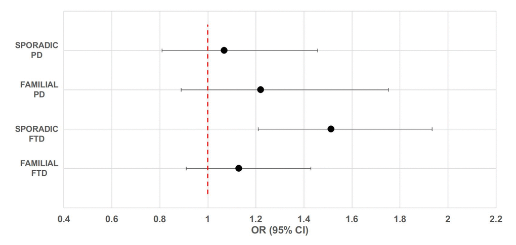 With respect to the involvement of APOE in FTD and PD, results in literature are inconsistent regarding the effect of the ε4 allele: some studies report an increased risk associated to this allele whereas others report no association [33–36]. In particular, studies focusing on the role of APOE in PD remain largely inconclusive, with some studies reporting APOE-ε2 allele associated with higher prevalence of sporadic PD [37]. Here we found that in all subgroups analyzed, carriers of APOE-ε4 allele are at higher risk of disease. In our previous study on LOAD, we observed a strong interaction between rs9472817 genotype and APOE-ε4 in determining the disease risk [20]. Here, we did not observe any significant interactions. However, subjects carrying at least one APOE-ε4 allele combined with the rs9472817-CC genotype had a significantly higher risk of sporadic FTD. The lack of interaction may be a consequence of an insufficient sample size, and hence the power to unveil a small interaction effect is limited, or it may be attributed to the lower risk conferred by the APOE-ε4 to FTD [38]. Alternatively, and more simply, it may be due to the fact that in FTD there is no interaction between these variants.