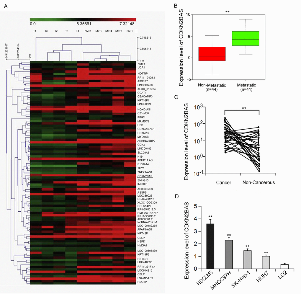 Human gene expression array was utilized to analyze the differential expression levels of lncRNAs in the metastatic and non-metastatic HCC tissues. As shown in Figure 1A, the hierarchical clustering analysis found that 137 non-coding RNA transcripts were expressed differently between two groups (over 2-fold, P < 0.01). CDKN2BAS is the most differentially expressed lncRNA, whose expression was 10 times higher than that in the non-metastatic group, implying that CDKN2BAS may be involved in the progression and metastasis of HCC. We further verified the expression of CDKN2BAS in HCC tissues (n=85) by qRT-PCR. The results showed that the expression of CDKN2BAS in the metastatic group was significantly higher than that in the non-metastatic group (Figure 1B). In addition, CDKN2BAS expression was up-regulated in most of the cancer tissues compared with the non-cancer tissues in the metastatic group (Figure 1C). Moreover, CDKN2BAS expression was highly related to the metastatic ability of HCC cell lines (Figure 1D). Together, these results indicate that CDKN2BAS is involved in HCC metastasis.