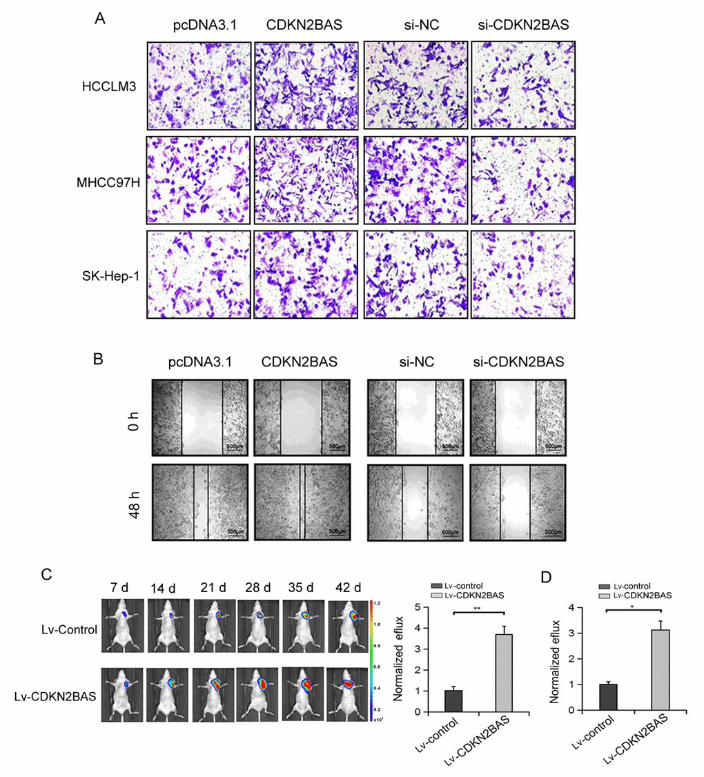 Next, we determined the effect of CDKN2BAS on HCC cell migration. Transwell migration assay showed that the migration ability of HCC cells was increased over 2-fold after CDKN2BAS overexpression, whereas the migration ability of HCC cells was significantly inhibited after CDKN2BAS knockdown (Figure 2A). Scratch assay confirmed the pro-metastatic role of CDKN2BAS in MHCC97H cells (Figure 2B). To examine the effect of CDKN2BAS in vivo, we used a bioluminescent mouse model. The results showed that overexpression of CDKN2BAS significantly increased the bioluminescent signals in mice injected with HCCLM3 or MHCC97H cells (Figure 2C-D). These results indicate that CDKN2BAS exerts a promotional role in HCC metastasis.