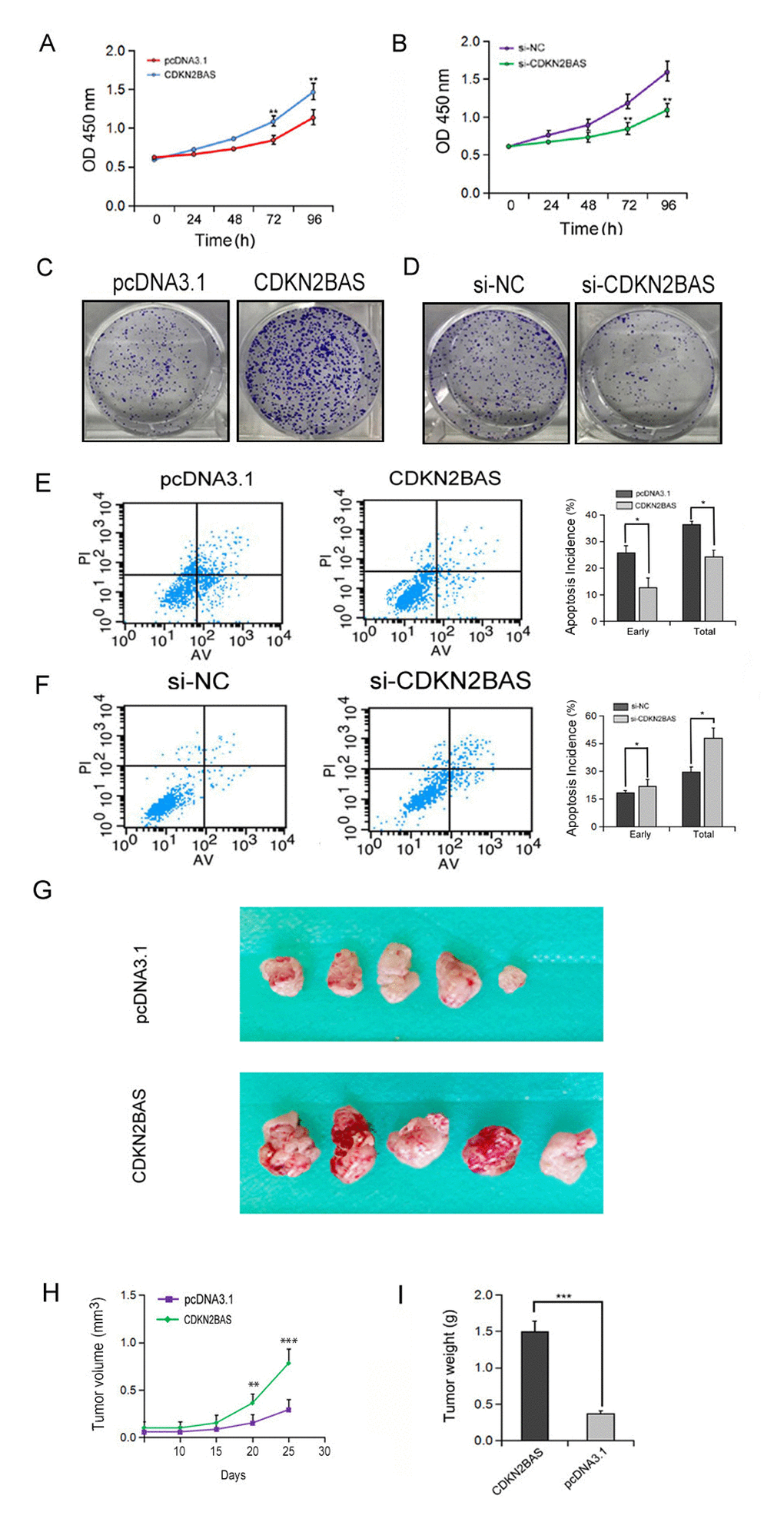 To detect the effect of CDKN2BAS on HCC cell growth, MTT assay was carried out. The results showed that overexpression of CDKN2BAS significantly increased the growth of MHCC97H cells, whereas knockdown of CDKN2BAS significantly inhibited cell growth (Figure. 3A-B). In agreement with these results, colony formation assay showed that CDKN2BAS overexpression significantly increased the colony number of MHCC97H cells, while opposite result was observed upon CDKN2BAS knockdown (Figure. 3C-D). Moreover, ectopic overexpression of CDKN2BAS significantly inhibited the apoptotic rate of HCC cells after EPT treatment (Figure 3E). In contrast, CDKN2BAS knockdown enhanced EPI-induced apoptosis (Figure 3F). In addition, the tumor xenograft model of MHCC97H cells in nude mice showed that overexpression of CDKN2BAS significantly increased the tumor volume and tumor weight (Figure 3G-I). Collectively, these results suggest that CDKN2BAS plays an oncogenic role in HCC.