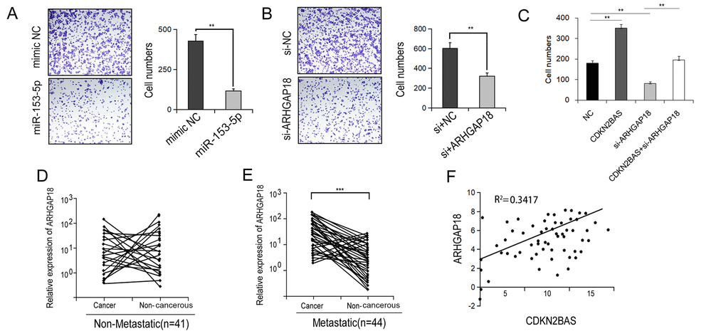 We then determined if the miR-153-5p/ARHGAP18 signaling contributed to CDKN2BAS-induced HCC cell migration. Transfection of miR-153-5p mimics significantly reduced the migration capacity of HCCLM3 cells (Figure 5A). Similar result was found following ARHGAP18 knockdown (Figure 5B). Moreover, knockdown of ARHGAP18 counteracted the promotional effect of CDKN2BAS on cell migration (Figure 5C). Additionally, in the metastatic group, ARHGAP18 expression was significantly up-regulated in cancer tissues compared with non-cancer tissues, while there was no significant difference in the non-metastatic group (Figure 5D-E). Furthermore, there was a significantly positive correlation between the expression of CDKN2BAS and ARHGAP18 (Figure 5F, R2 = 0.3417). Together, these results indicate that CDKN2BAS promotes cell migration via the miR-153-5p/ARHGAP18 signaling.