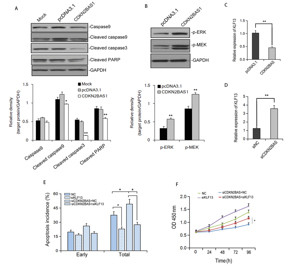 To understand the mechanism of CDKN2BAS-mediated apoptosis inhibition, we first determined the effect of CDKN2BAS on the expression of apoptosis-related proteins. Western blot analysis showed that overexpression of CDKN2BAS significantly eliminated the protein levels of cleaved-caspase 9, cleaved-Caspase 3 and cleaved-PARP induced by EPI in HCCLM3 cells (Figure 6A). Additionally, overexpression of CDKN2BAS activated MEK/ERK signaling pathway (Figure 6B). Also, transfection of CDKN2BAS reduced the expression of KLF13, a potential negative regulator of MEK/ERK signaling pathway. In contrast, knockdown of CDKN2BAS up-regulated KLF13 protein level (Figure 6C-D). Knockdown of KLF13 markedly inhibited EPI-induced apoptosis and obviously eliminated the increased apoptosis induced by CDKN2BAS knockdown (Figure 6E). Moreover, silencing of KLF13 restrained the inhibitory effect of CDKN2BAS knockdown on the viability of HCC cells (Figure 6F). These results indicated that CDKN2BAS suppresses EPI-induced apoptosis via down-regulation of KLF13 and activation of MEK/ERK pathway.
